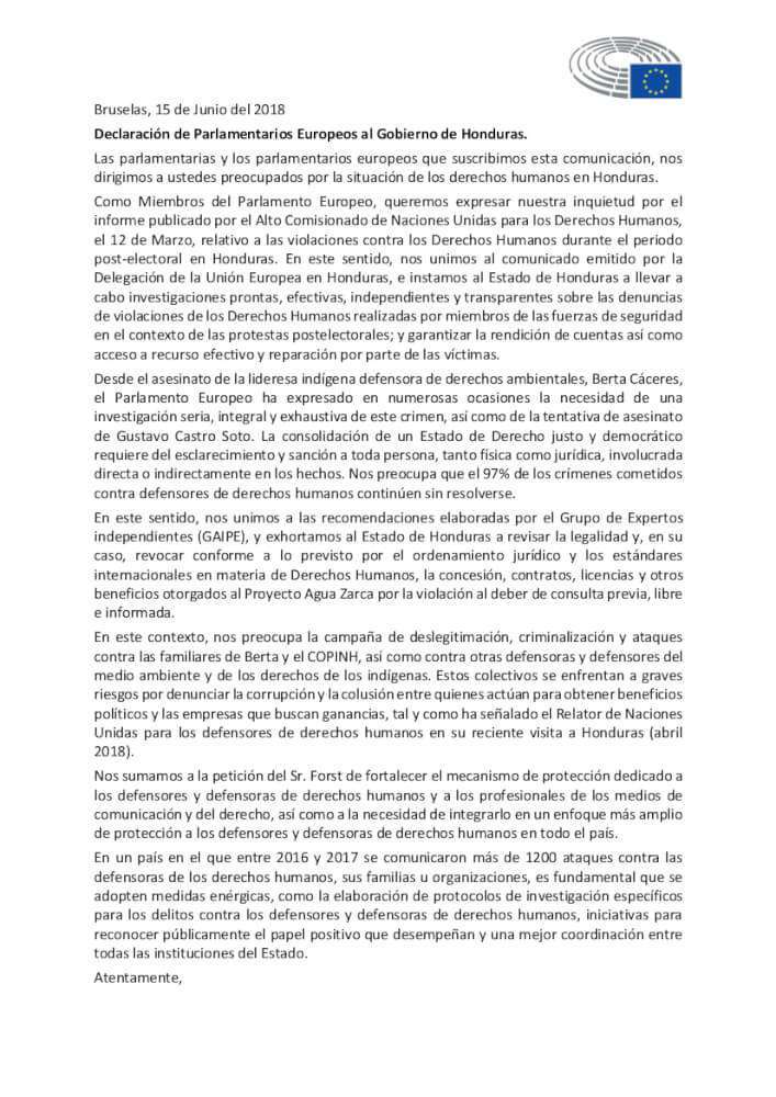 Ciudad de México | Desinformémonos. Los integrantes del Consejo Cívico de Organizaciones Populares e Indígenas de Honduras (COPINH) celebraron la carta de 50 miembros del Parlamento Europeo dirigida al gobierno del presidente hondureño Juan Orlando Hernández e instituciones del país para que “se revoquen la concesión, contratos, licencias y otros beneficios otorgados al Proyecto Agua Zarca por la violación al deber de consulta previa, libre e informada” a los pueblos indígenas.