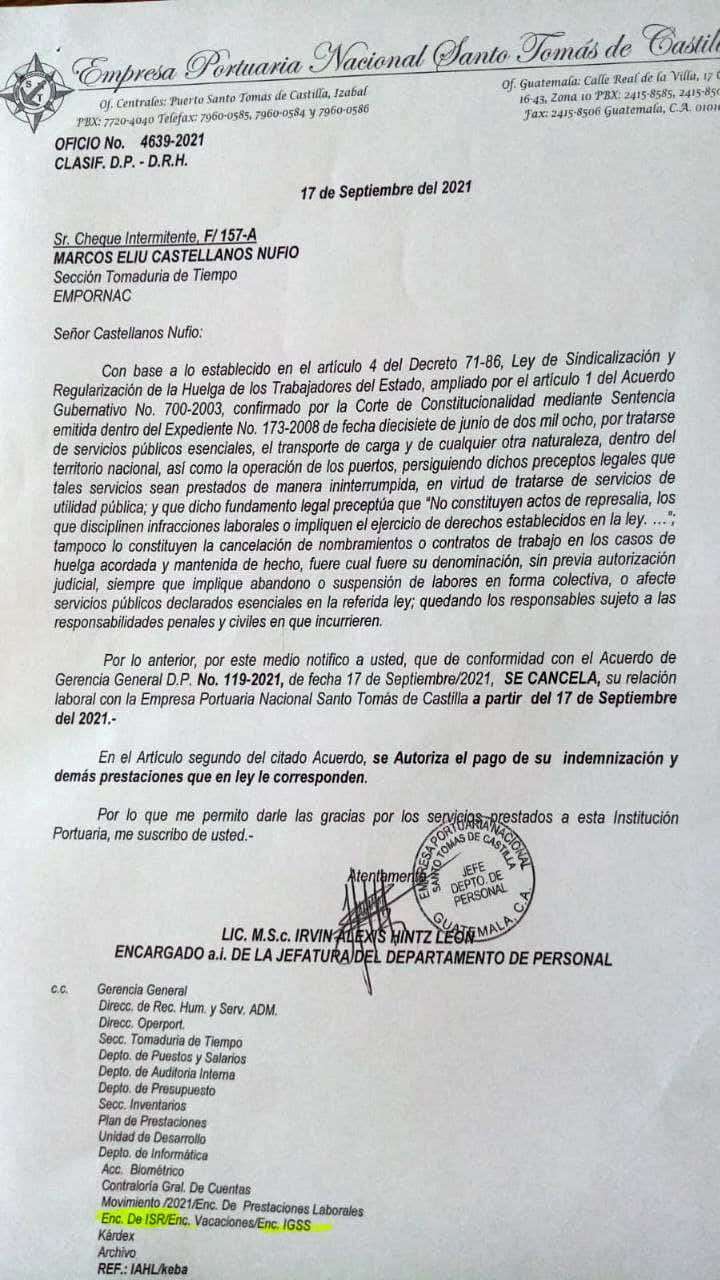 Asimismo fueron notificados de su destitución laboral: el Secretario General Víctor Oliva Archila quien ha laborado para la Empornac 22 años como estibador con un record laboral limpio, y Edwin Estuardo Martínez Tobar Secretario de Finanzas quien ha laborado por unos 25 años como cheque intermitente de igual forma con un buen record laboral.