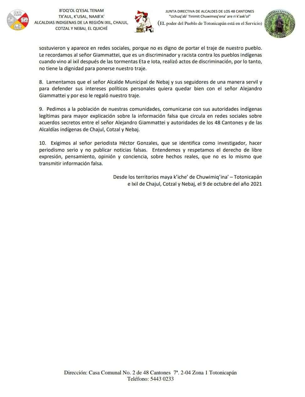 - En el caso del pueblo maya ixil, también queremos ACLARAR que las personas que se reunieron con el señor Giammatteti Falla son el Alcalde Municipal Virgilio Gerónimo Bernal Guzmán, el señor Francisco Brito Ceto, Síndico Primero y la señora María Cedillo Corio, Concejal segundo subordinados al Alcalde Municipal y simpatizante de su partido político; por esa razón le exigimos públicamente al señor Alejandro Eduardo Giammattei Falla devolver públicamente el cotón (saco rojo ixil de Nebaj) que le entregaron los supuestos líderes del ixil que estuvieron en la reunión que sostuvieron y aparece en redes sociales, porque no es digno de portar el traje de nuestro pueblo. Le recordamos al señor Giammattei, que es un discriminador y racista contra los pueblos indígenas cuando vino al ixil después de las tormentas Eta e Iota, realizó actos de discriminación, por lo tanto, no tiene la dignidad para ponerse nuestro traje.