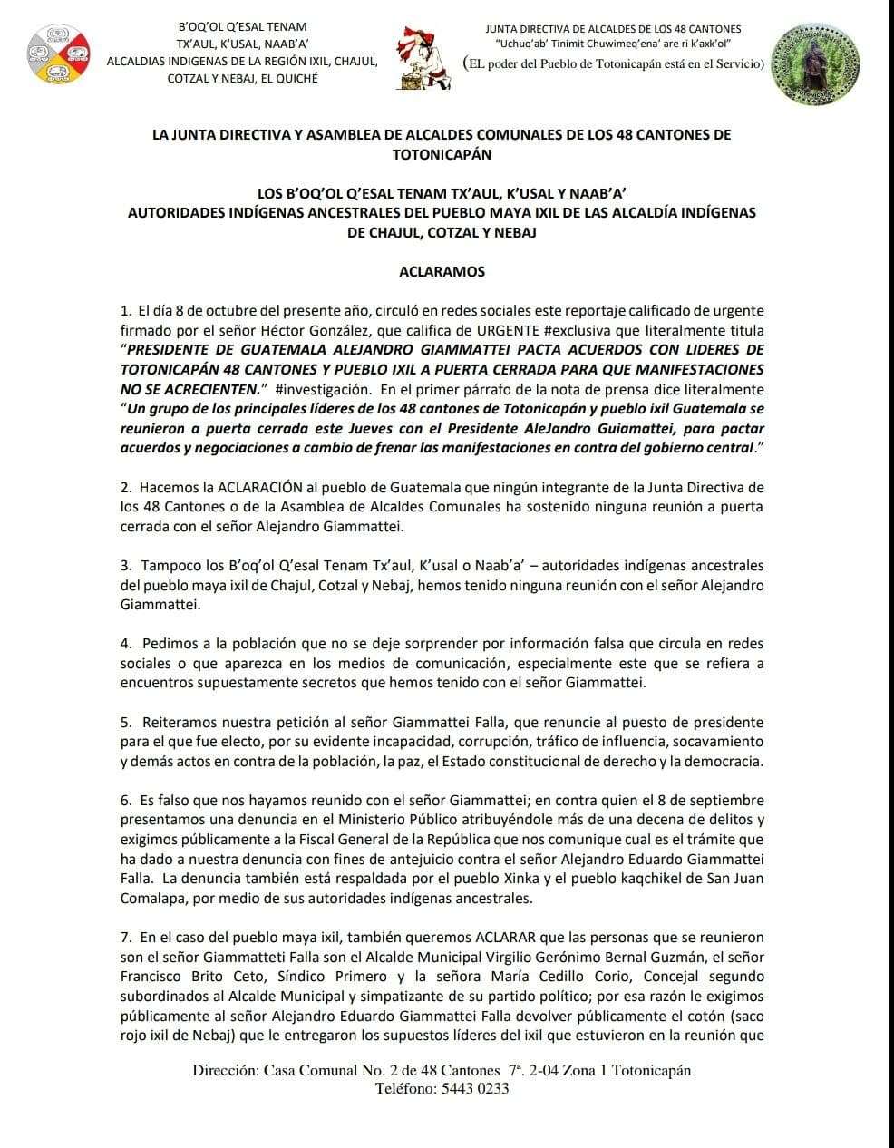 - Hacemos la ACLARACIÓN al pueblo de Guatemala que ningún integrante de la Junta Directiva de los 48 Cantones o de la Asamblea de Alcaldes Comunales ha sostenido ninguna reunión a puerta cerrada con el señor Alejandro Giammattei.