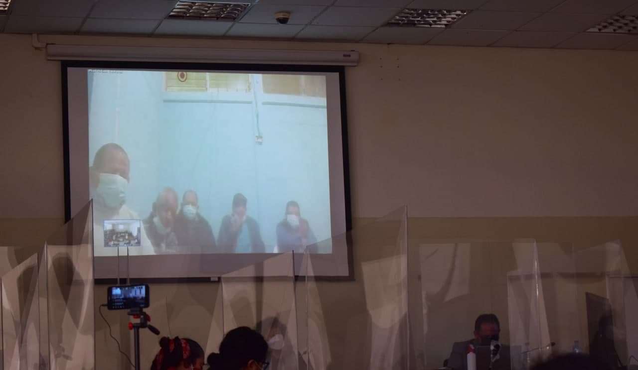 Benvenuto Ruiz Aquino, Bernardo Ruiz Aquino, Damián Cuxum Alvarado, Gabriel Cuxum Alvarado, Francisco Cuxum Alvarado, desde una pantalla lejana y de baja resolución asomaban sus rostros cubiertos con mascarillas, reaccionaban ante las intervenciones de sus abogados de la defensa, movían los brazos y manos aprobando o desaprobando lo que se decía en la sala. Una imagen irreal para un juicio dolorosamente verdadero.