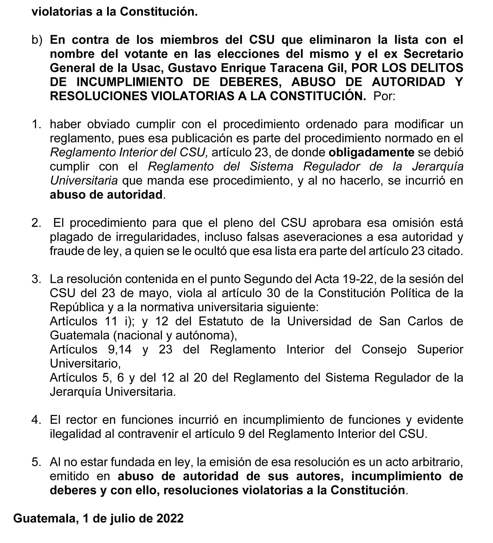 La AEU denunció penalmente a 18 consejeros que avalaron el fraude en la elección a rector, también a Pablo Oliva Soto ex rector, Walter Mazariegos decano de Humanidades, Gustavo Taracena Gil, ex secretario de la USAC y Luis Cordón Lucero, del departamento jurídico por incumplimiento de deberes, abuso de autoridad y resoluciones violatorias a la Constitución.