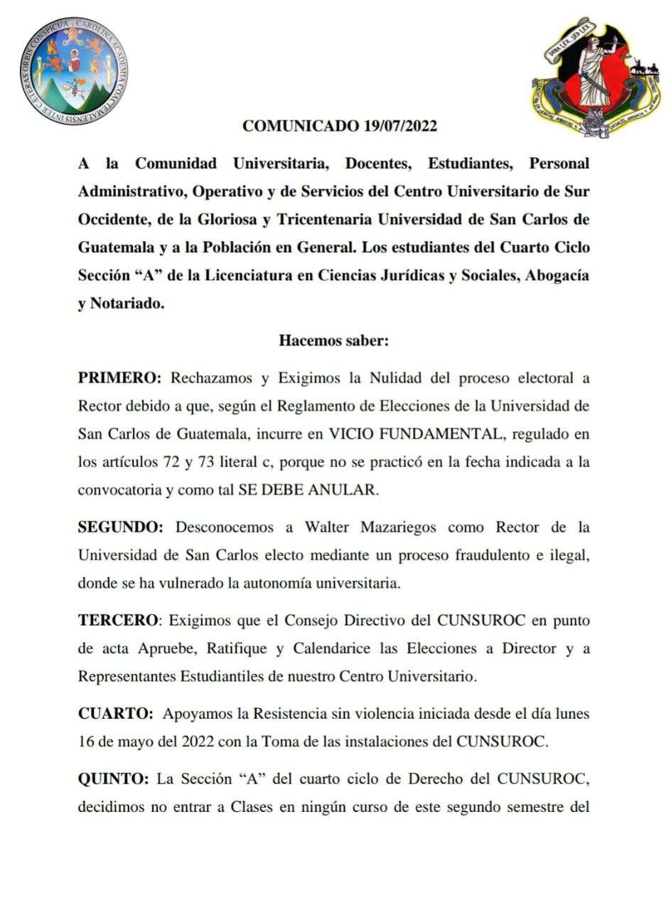 Las carreras de ciencias jurídicas y sociales en los Centros Regionales, comienzan a despertar y se declaran varias de estas en paro académico y no se realizarán clases, como en el CUNSUROC, estudiantes del cuarto ciclo “A” desconoció a Walter Mazariegos como autoridad de la Universidad, exigen la nulidad del proceso electoral y una nueva elección a rector, en el que no participen las mafias, ni personas vinculadas a estas. Exigen a la coordinación del Centro y a los docentes a pronunciarse en contra del fraude y se sumen a la digna resistencia con la toma del Centro y el paro.