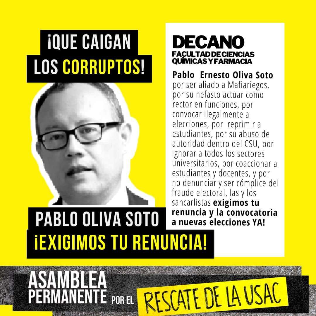 - “La cuota de responsabilidad de los decanos ante el fraude es grande”. La Asamblea Permanente por el rescate de la USAC y estudiantes de 8 de 10 Facultades de la Universidad, exigen la renuncia de sus decanos, por su responsabilidad en el fraude. Esta campaña iniciada por la Asamblea Permanente incluye descripciones de los señalamientos hacia cada uno de los 8 decanos del CSU que han votado a favor de mantener a Walter Mazariegos en rectoría.