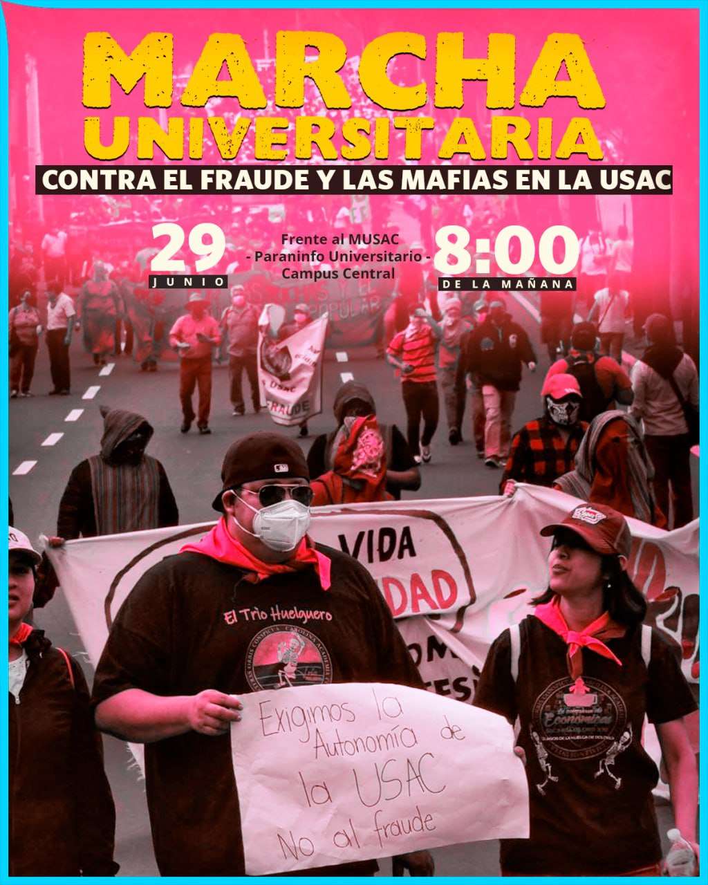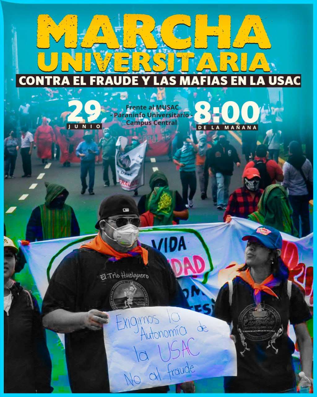 Convocatoria a la tercera Marcha Universitaria contra el Fraude y las mafias en la USAC. Nos vemos mañana en el MUSAC #29J ¡Mazariegos ya sabe que el fraude se le cae!