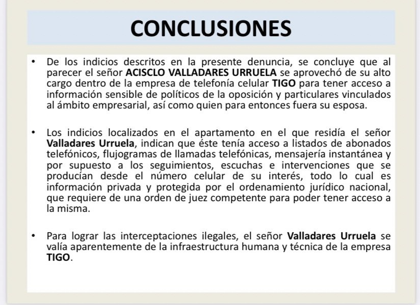 “Como resultado de la diligencia se logró la obtención de indicios relevantes y significativos que permiten inferir la práctica de seguimientos, escuchas e intervenciones de teléfonos celulares sin la debida orden judicial por parte de funcionarios de la empresa telefónica TIGO, cuyos resultados eran reportados al señor Acisclo Valladares Urruela”, informaron.