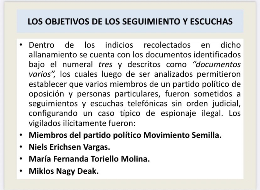 La CICIG aseguró que dentro de los indicios recolectados en el allanamiento se cuenta con los documentos, los cuales luego de ser analizados permitieron establecer que varios miembros de un partido político de oposición y personas particulares, fueron sometidos a seguimientos y escuchas telefónicas sin orden judicial, “configurando un caso típico de espionaje ilegal”.