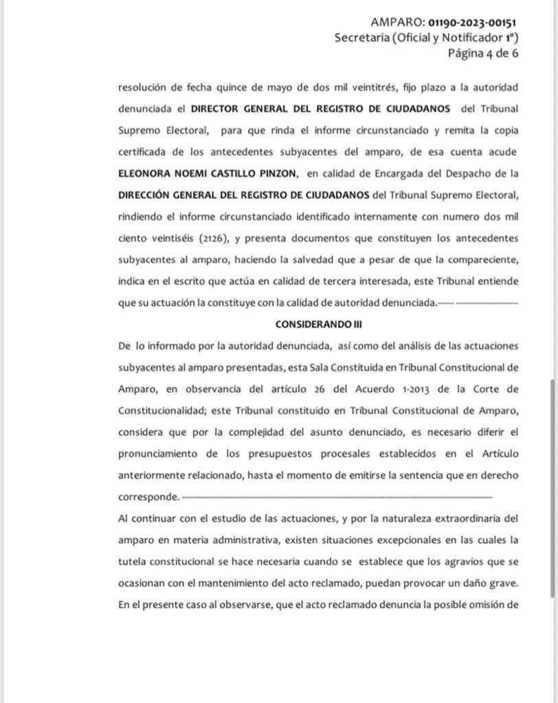 “Declara: l) El otorgamiento del amparo provisional, solicitado por Edwin Estuardo Flores Pérez, en la calidad con la que actúa con el único efecto de dejar en suspenso en lo que corresponde al derecho propio del amparista, el acto reclamado consiste en la resolución emitida por la Dirección General del Registro de Ciudadanos del 12 de diciembre del 2022”, resolvió la Sala.