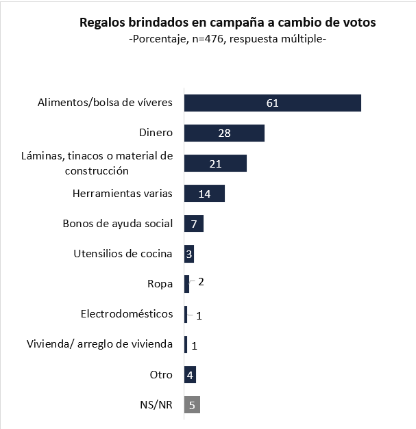 Mientras el 59 % de las personas encuestadas reportaron conocer sobre regalos y favores a cambio de votos en su comunidad durante la campaña electoral 2023 solo el 10% de los encuestados a nivel individual admite haber recibido un regalo o dádiva a cambio de su voto.