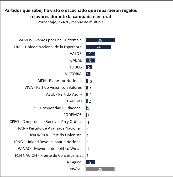 El partido Vamos, con el que resultó electo el presidente Alejandro Giammattei, es el que más regalos o favores ha repartido en esta campaña electoral, según una encuesta realizada por CID Gallup, datos incluido en el informe del Mirador Electoral.