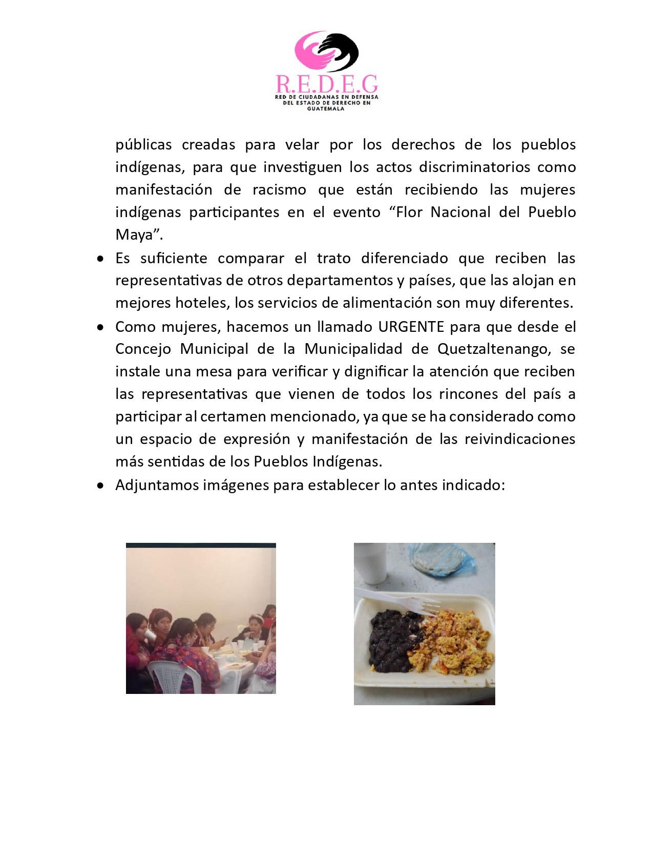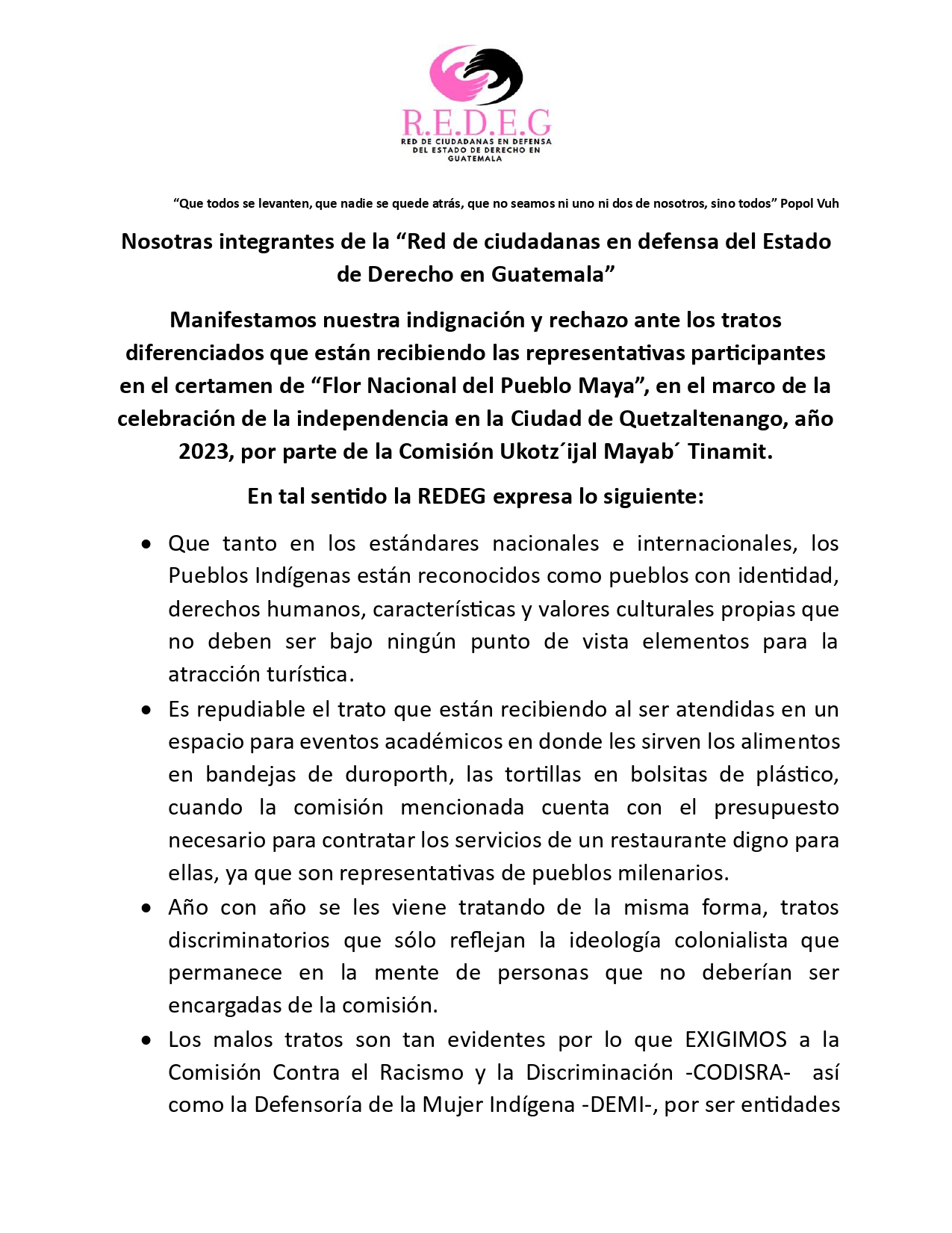 La Red de Ciudadana en defensa del Estado de Derecho en Guatemala (REDEG) expresó su indignación y rechazo a los tratos diferenciados de parte de la Comisión de Ukotz’ijal Mayab’ Tinamit, que organiza el certamen Flor Nacional del Pueblo Maya.