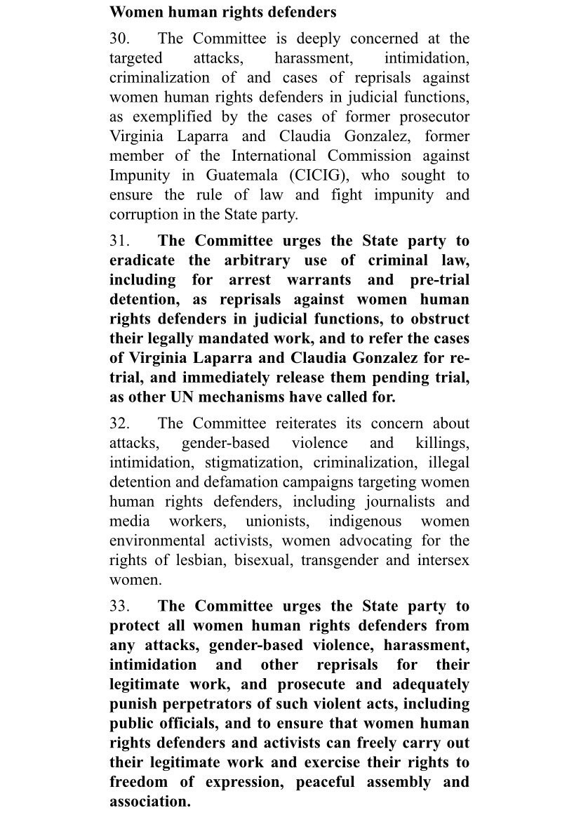 “El Comité reitera su preocupación por los ataques, la violencia de género y los asesinatos, la intimidación, la estigmatización, la criminalización, las detenciones ilegales y las campañas de difamación dirigidas a las defensoras de los derechos humanos, incluidas periodistas y trabajadoras de los medios de comunicación, sindicalistas, activistas medioambientales indígenas y mujeres que defienden los derechos de mujeres lesbianas, bisexuales, transgénero e intersexuales”, concluyó en esa parte del informe.