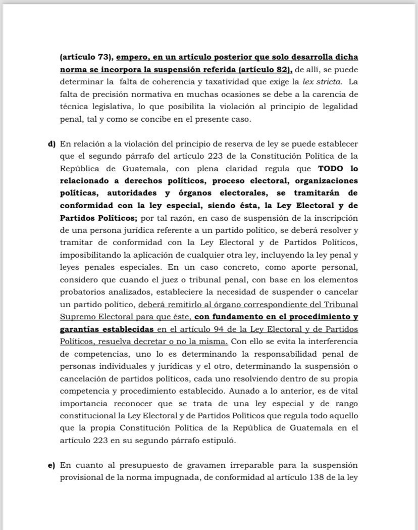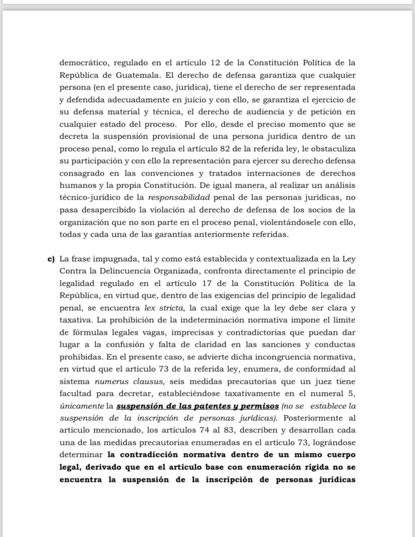 El abogado Alexander Ainzestatd, fue quien comunicó en sus redes sociales que la misma no fue suspendida provisionalmente. “Corte de Constitucionalidad se pronuncia sobre norma que permite suspender personas jurídicas de manera provisional y se resuelve No Decretar la Suspensión Provisional. Suscriben Perez Aguilera, Vásquez Pimentel, Molina Barreto, Ochoa Escriba, con voto disidente de López C.”, escribió.