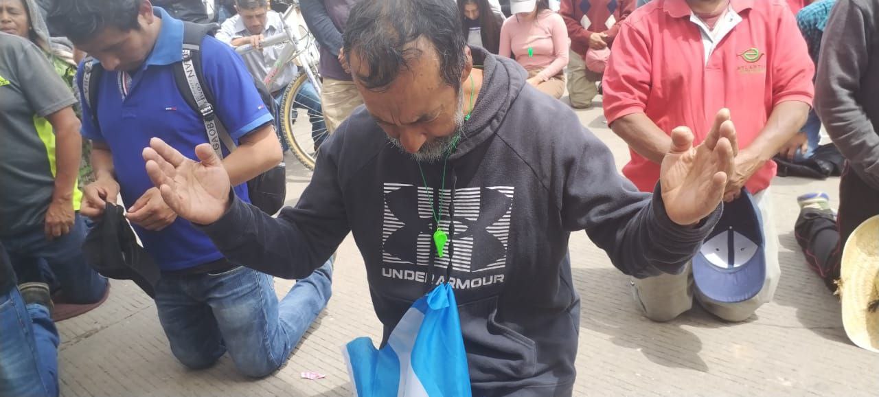 Los manifestantes realizan una oración en la que piden por la protección de Dios durante la serie de movilizaciones que piden la renuncia de Consuelo Porras, Rafael Curruchiche y el juez Fredy Orellana.