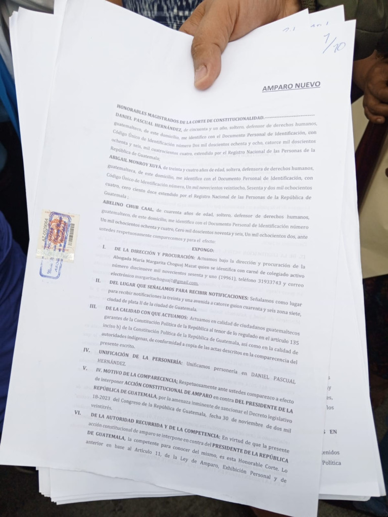 El plantón indefinido sobre la 7 avenida y 9 calle de la zona 1  ha terminado después de dos semanas, sin embargo, las autoridades ancestrales de Iximulew prometen regresar en enero próximo, y continúan apostándole a la legalidad para respaldar sus demandas.  Este lunes, 4 de diciembre, presentaron una acción de inconstitucionalidad de amparo para que la Corte de Constitucionalidad (CC) exija a los parlamentarios anular el Presupuesto General para 2024 y revisarlo, ya que aluden a anomalías e ilegalidades en el proceso de aprobación.