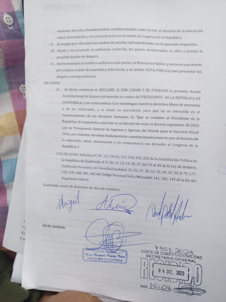 Momentos después, se movilizaron sobre la línea del tren, detrás de la Dirección General de la Policía, hacia la CC, en donde entregaron una acción inconstitucional de amparo contra los diputados del Congreso, por haber aprobado el Presupuesto General para el 2024. Pese a las anomalías y reducciones presupuestarias que perjudicarán el acceso a los servicios básicos de la gente.