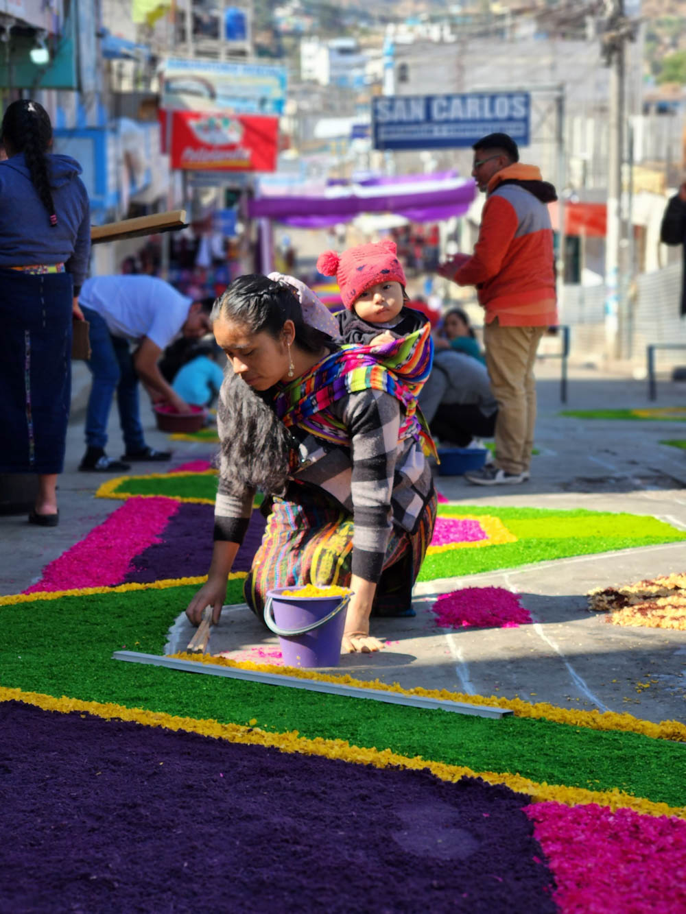 Con niños en brazos, niños devotos y toda la familia, así se involucran en la acostumbrada realización de las alfombras, esto con motivo de la mañana de vía crucis que recorrerá las principales calles del municipio de Comitancillo San Marcos, a unos 248 kilómetros de la ciudad de Guatemala.