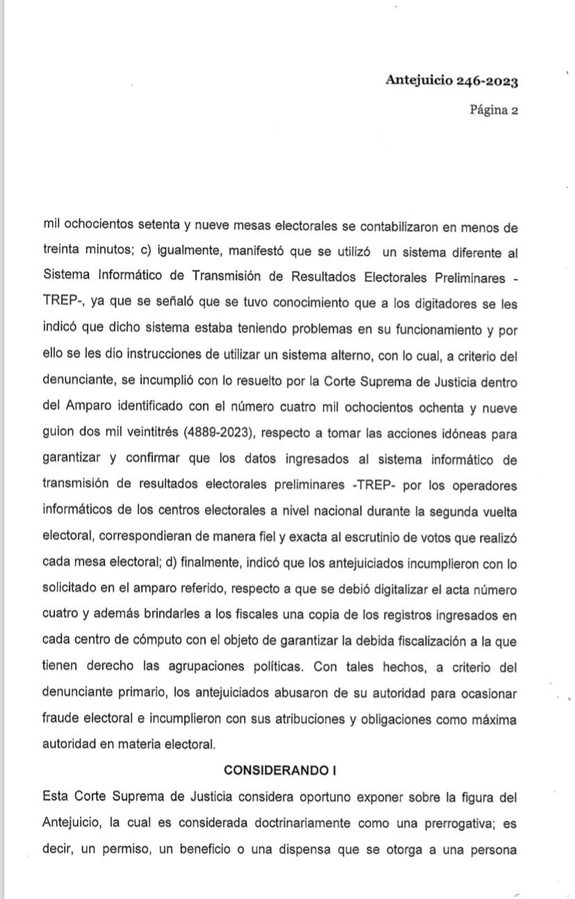 Lo anterior por la existencia de supuestas irregularidades en la segunda vuelta de las elecciones generales, llevada a cabo el 20 de agosto del 2023, con el objeto de elegir al binomio presidencial para el período 2024-2028, y en relación a ello denunció: a) la existencia de actas con el mismo número de mesa, generando un excedente de ciento sesenta y cuatro actas; b) asimismo, expuso que el escrutinio se realizó de manera precipitada, ya que el Tribunal Supremo Electoral estipula un tiempo aproximado de 45 minutos para poder concluir el escrutinio de cada mesa electoral y posteriormente redactar las actas respectivas.