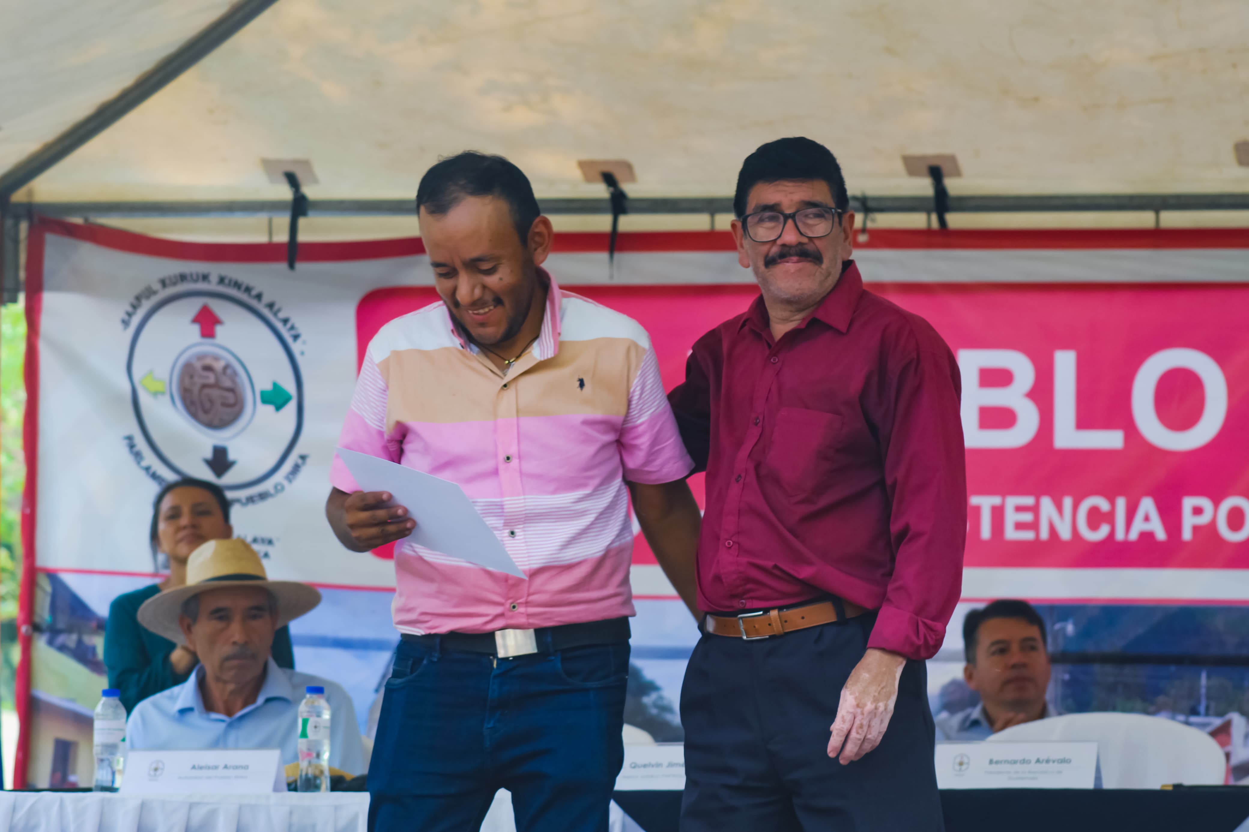 La actividad continuó con un emotivo reconocimiento a los dirigentes comunitarios del Pueblo Xinka, quienes han enfrentado la criminalización debido a su labor en la protección de los recursos naturales. Este gesto de reconocimiento fue especialmente significativo dada la difícil situación que muchos de estas personas han enfrentado por ejercer su derecho legítimo a la manifestación y la defensa de su territorio ancestral.