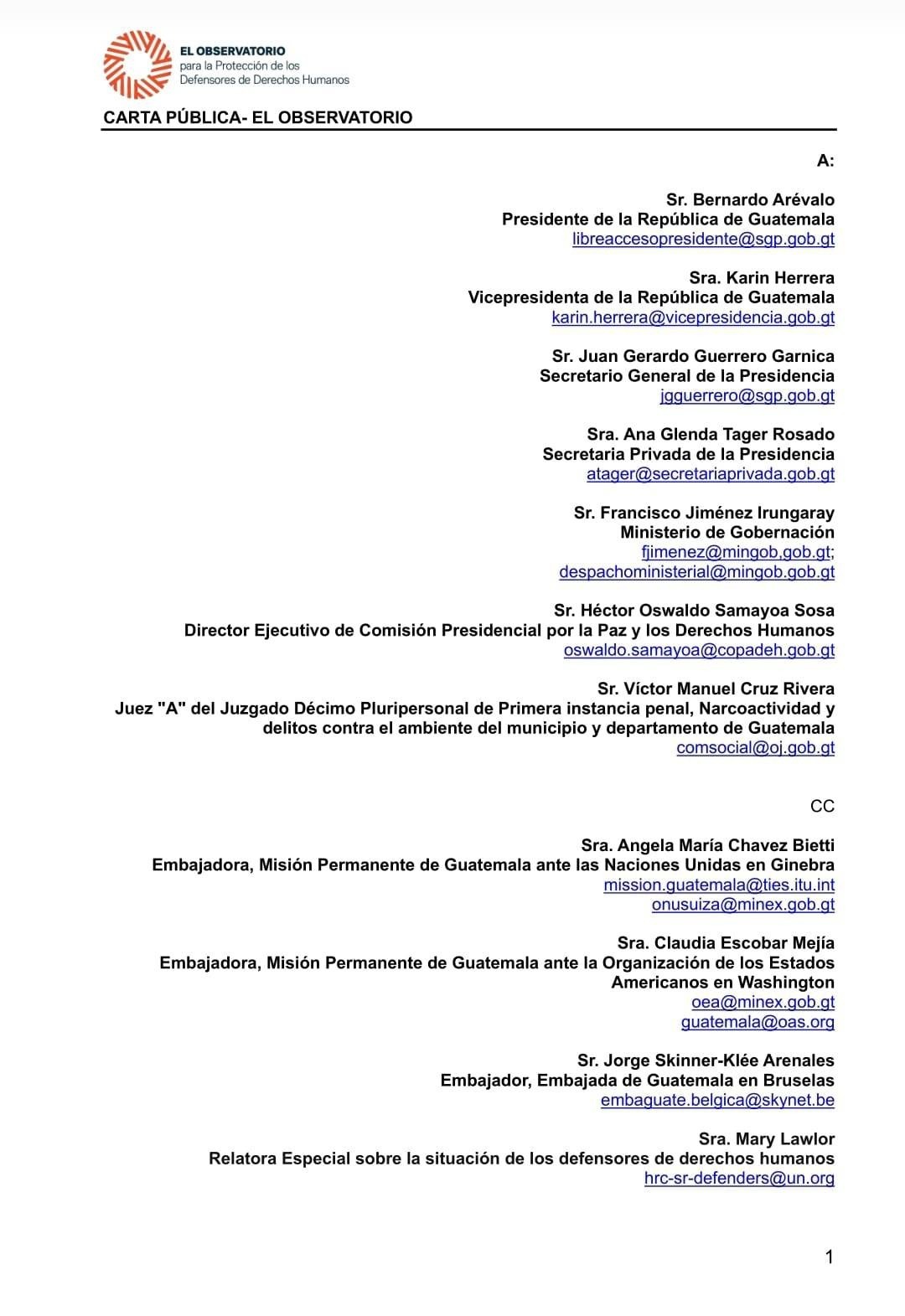 “Nos dirigimos a ustedes con el objetivo de hacer un llamado sobre el proceso de criminalización y persecución dirigida desde el poder judicial del Estado guatemalteco en contra del Sr. Ramón Cadena y otras 26 personas”, inicia la carta que también está dirigida a la vicepresidenta, Karin Herrera; al ministro de Gobernación, Francisco Jiménez; al director ejecutivo de la Comisión Presidencial por la Paz y los Derechos Humanos (Copadeh), Oswaldo Samayoa, al juez Víctor Cruz a cargo del caso, entre otros funcionarios.