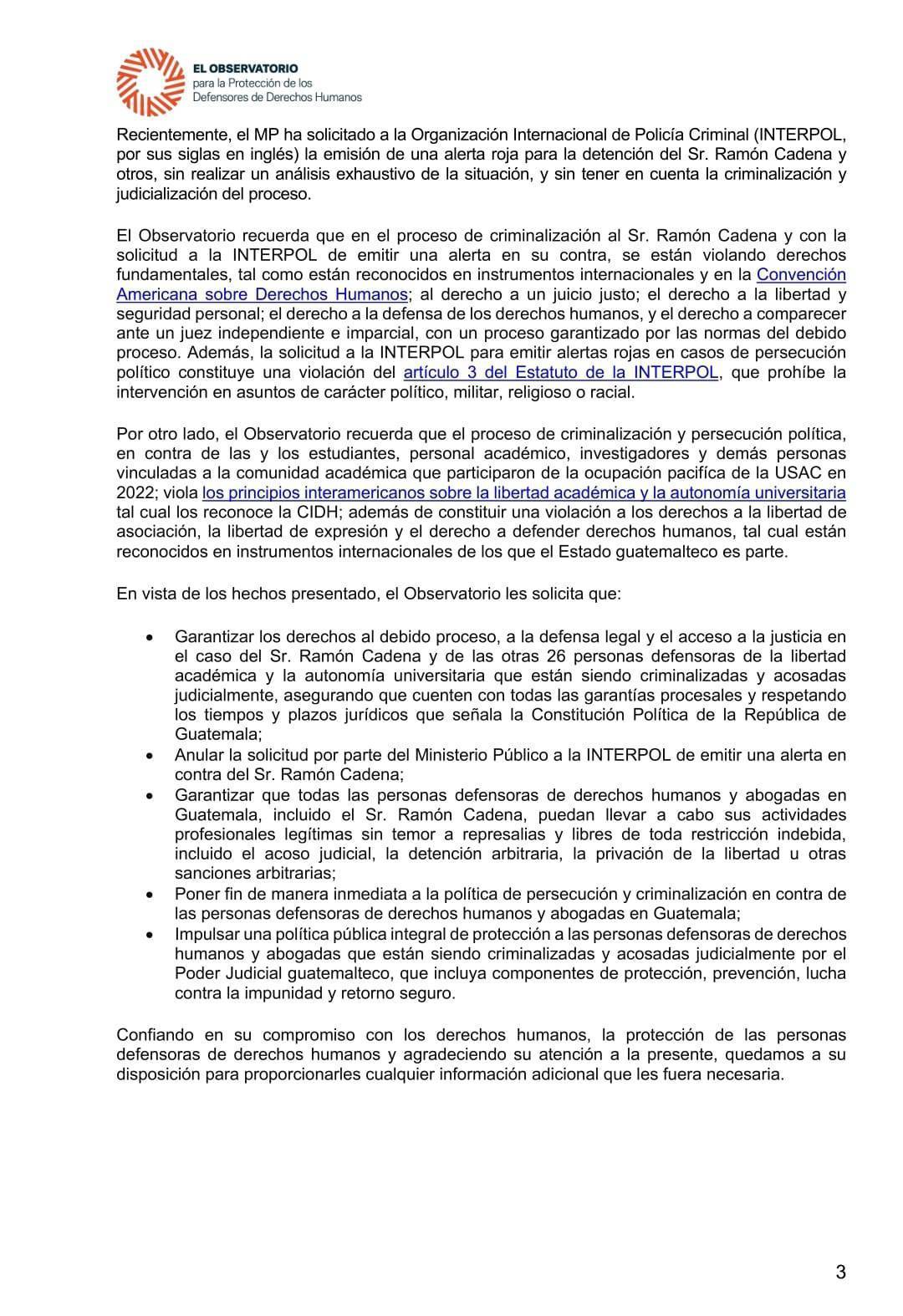 “El observatorio recuerda que el proceso de criminalización y persecución política, en contra de las y los estudiantes, personal académico, investigadores y demás personas vinculadas a la comunidad académica que participaron de la ocupación pacífica de la USAC en 2022 viola los principios interamericanos sobre la libertad académica y la autonomía universitaria. Además de constituir una violación de los derechos a la libertad de asociación, la libertad de expresión y el derecho a defender derechos humanos tal cual están reconocidos en instrumentos internacionales de los que el Estado guatemalteco es parte”, se lee en la carta.