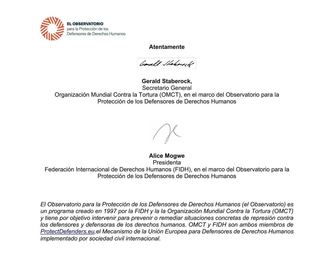 La carta está firmada por Gerald Staberock, de la Organización Mundial Contra la Tortura; y Alice Mogwe, de la Federación Internacional de Derechos Humanos.