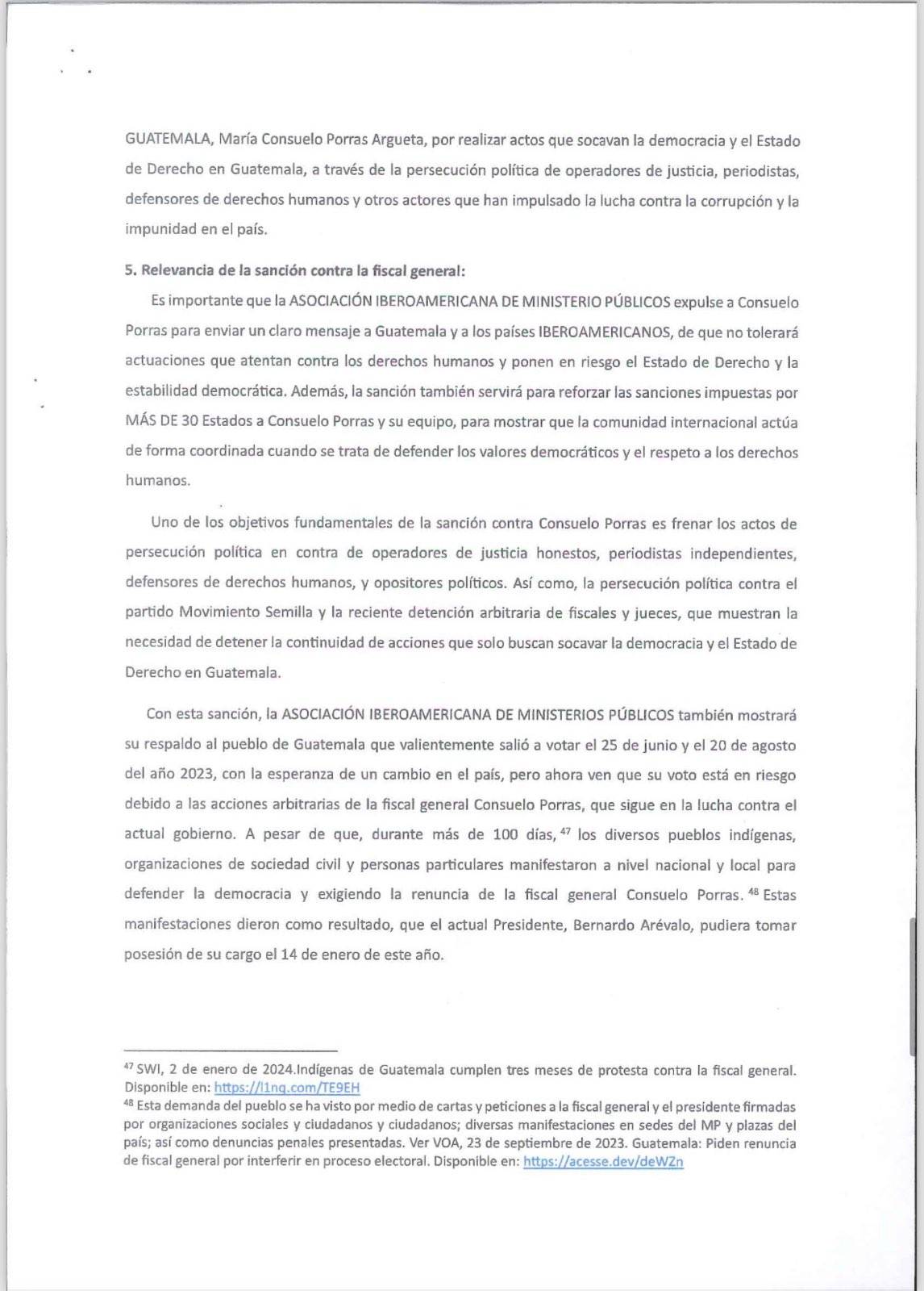 Por esa razón se pide la expulsión de Consuelo Porras y suspender al MP de Guatemala de toda actividad o participación en la Asociación Iberoamericana de Ministerios Públicos. “Ha utilizado el Ministerio Público para tomar represalias en contra de fiscales y jueces que investigaron y procesaron los casos de corrupción del período de la CICIG”, menciona.