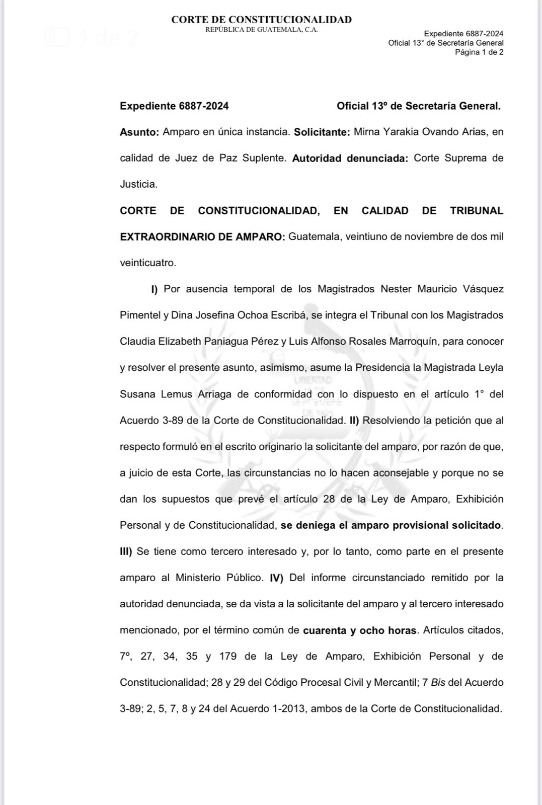 La Corte de Constitucionalidad (CC) negó un amparo provisional solicitado por Mirna Yarakia Ovando Arias, jueza suplente en el Organismo Judicial (OJ), señalada en el caso denominado Fugas del Sistema Penitenciario, presentado por la antigua FECI y la CICIG, en 2019. La investigación detectó a una supuesta red criminal que habría colaborado con la fuga de distintos reos, entre ellos, el narcotraficante mexicano Ramón Antonio Yáñez Ochoa.