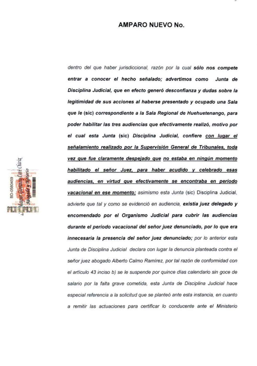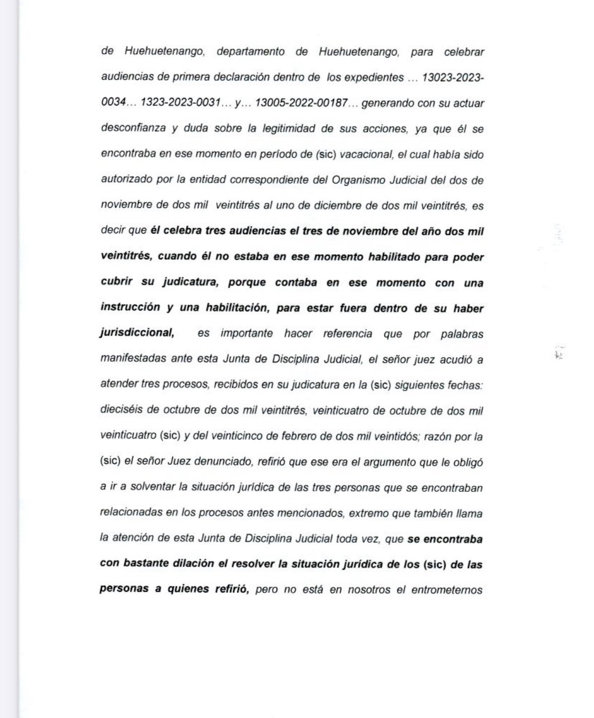 “Con lugar el señalamiento realizado por la Supervisión General de Tribunales, toda vez que fue claramente despejado que no estaba en ningún momento habilitado el señor juez, para haber acudido y celebrado esas audiencias, en virtud que efectivamente se encontraba en período vacacional en ese momento: asimismo esta Junta (sic) Disciplina Judicial, advierte que tal y como se evidenció en audiencia, existía juez delegado y encomendado por el Organismo Judicial para cubrir las audiencias durante el período vacacional del señor juez denunciado”, indica el motivo de la sanción.