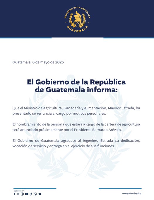 Maynor Estrada hizo pública su renuncia como titular del Ministerio de Agricultura, Ganadería y Alimentación (MAGA) a través de un video en el que dijo que la decisión obedece a motivos personales y de salud. “Mi renuncia responde a circunstancias familiares y de salud”, declaró Estrada, quien además agradeció la oportunidad de haber servido al pueblo de Guatemala.