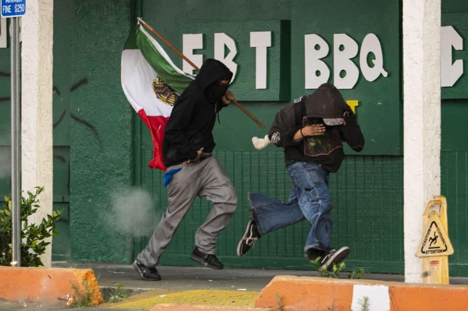 Megáfono en mano, la mujer grita: “Los vemos como lo que son, una organización terrorista. ICE (Servicio de Inmigración y control de Aduanas), fuera de Paramount. No son bienvenidos aquí”. Junto a ellas, otras mujeres enarbolan banderas de Estados Unidos y de México, además de pancartas, que rechazan las redadas y expulsiones, rodeados de nubes de gases lacrimógenos lanzados por la Guardia Nacional desde sus vehículos acorazados.