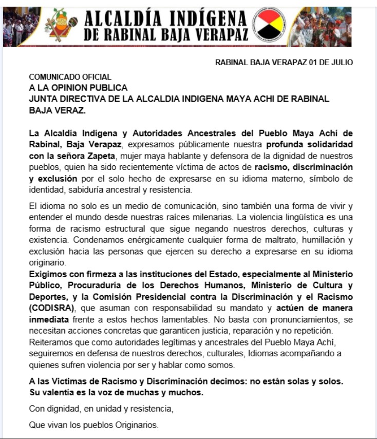 La Alcaldía Indígena de Rabinal, Baja Verapaz, también se pronunció mediante un comunicado oficial, solidarizándose con la viceministra Zapeta. En su declaración, exigieron acciones para garantizar la justicia, reparación y no repetición de estos hechos, señalando que “la violencia lingüística es una forma de racismo estructural que sigue negando nuestros derechos, culturas y existencia”.