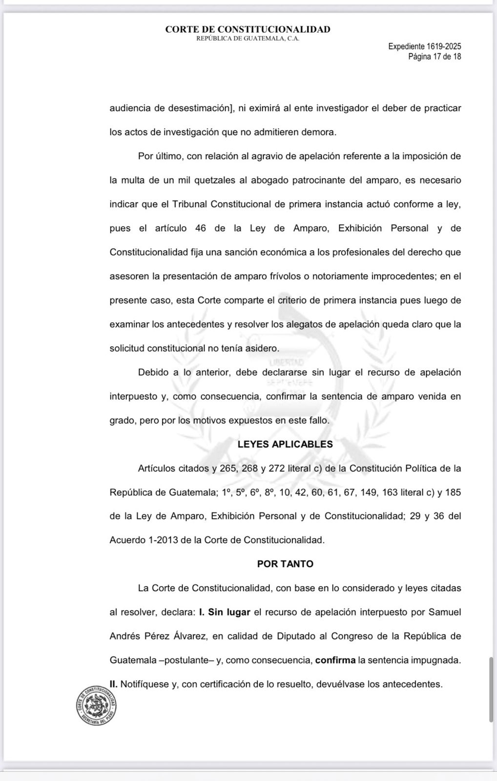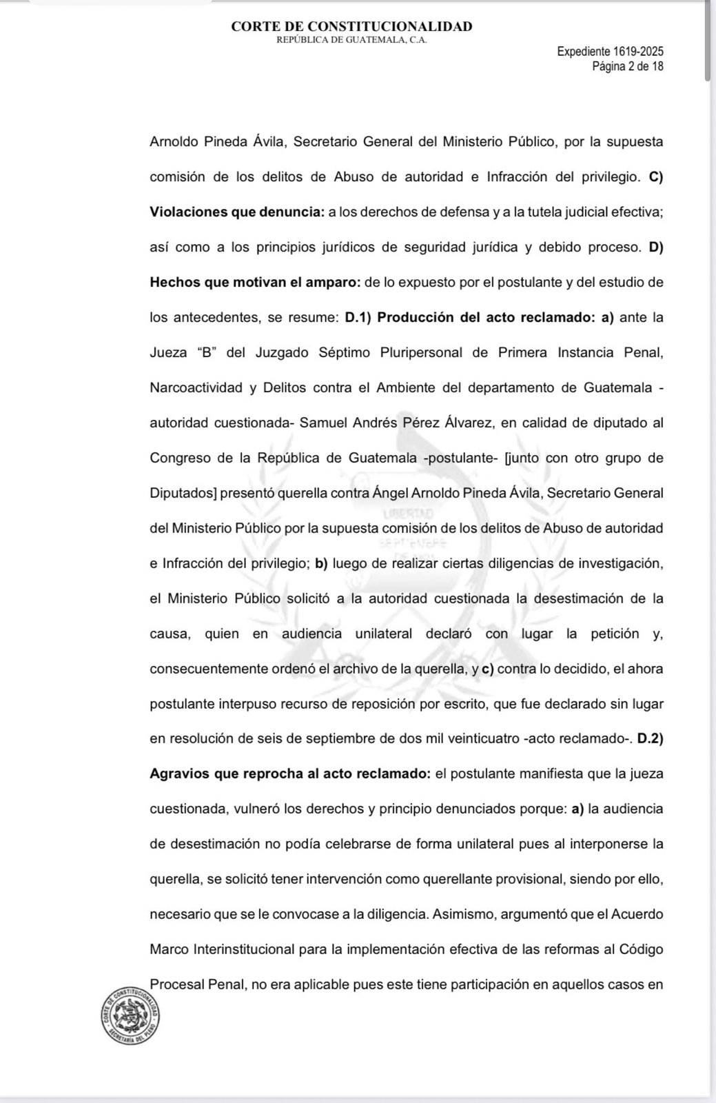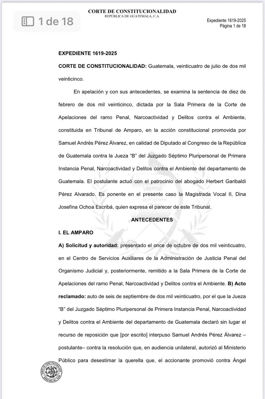 La Corte de Constitucionalidad respaldó, por unanimidad, al secretario del MP y confirmó el archivo de la denuncia del diputado Samuel Pérez sobre presunta filtración de información a cuentas anónimas en X.