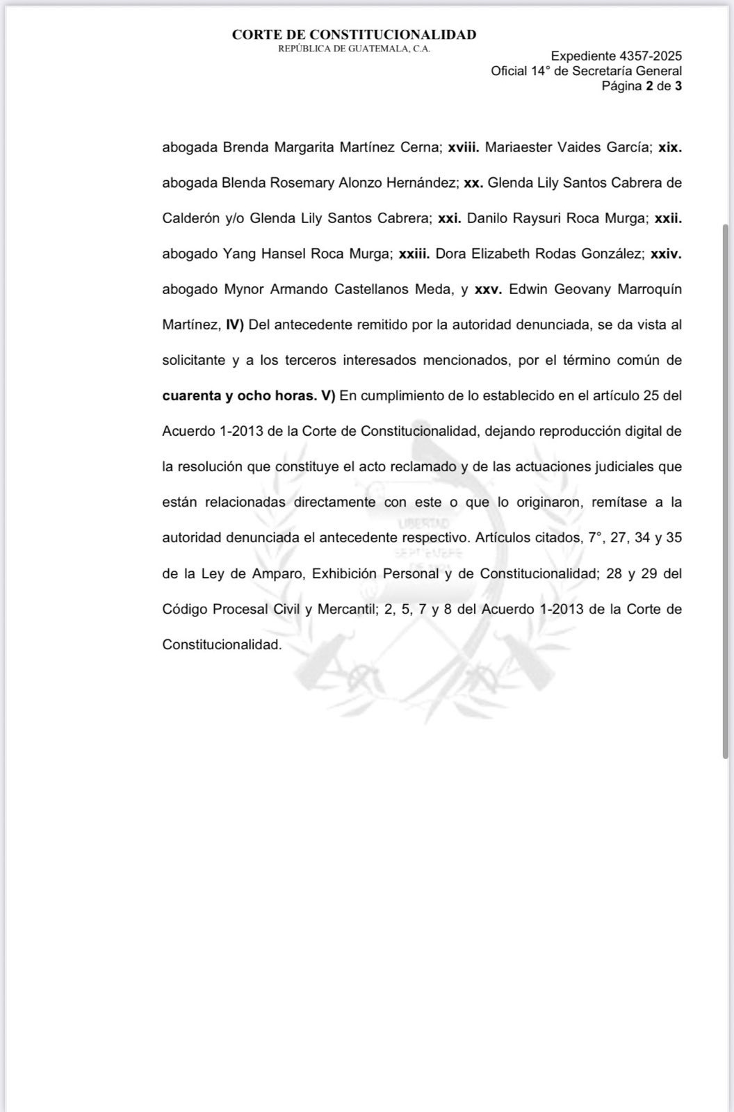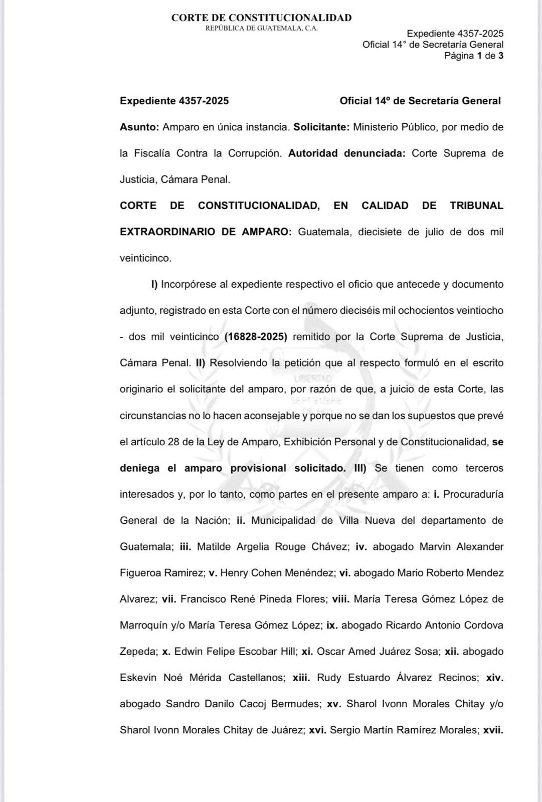 Eso quiere decir que se mantiene la decisión que benefició al exfuncionario y su equipo municipal, aunque por ahora la resolución es provisional y quedará pendiente que la Corte de Constitucionalidad dicte un fallo definitivo que podría reactivar el proceso penal y ordenar a la Corte Suprema de Justicia (CSJ) que analice la solicitud del ente investigador.