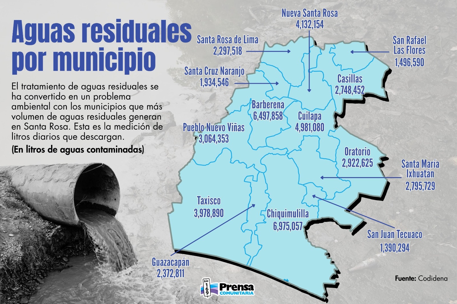 Solo el 5.19% del volumen desechado es tratado y de forma inadecuada, señala el estudio. Los municipios que más volumen de aguas residuales generan diariamente son Chiquimulilla, Cuilapa, Barberena y Nueva Santa Rosa.