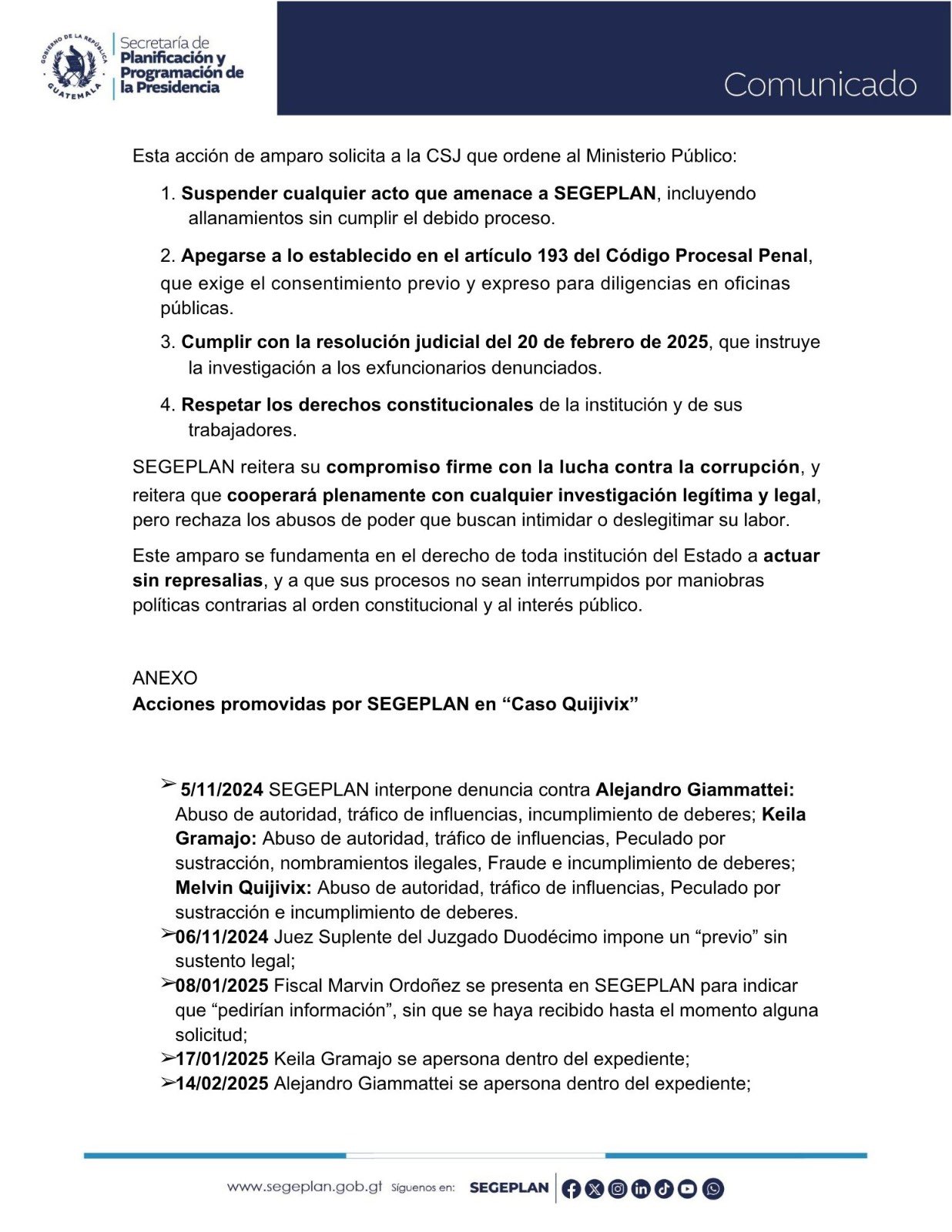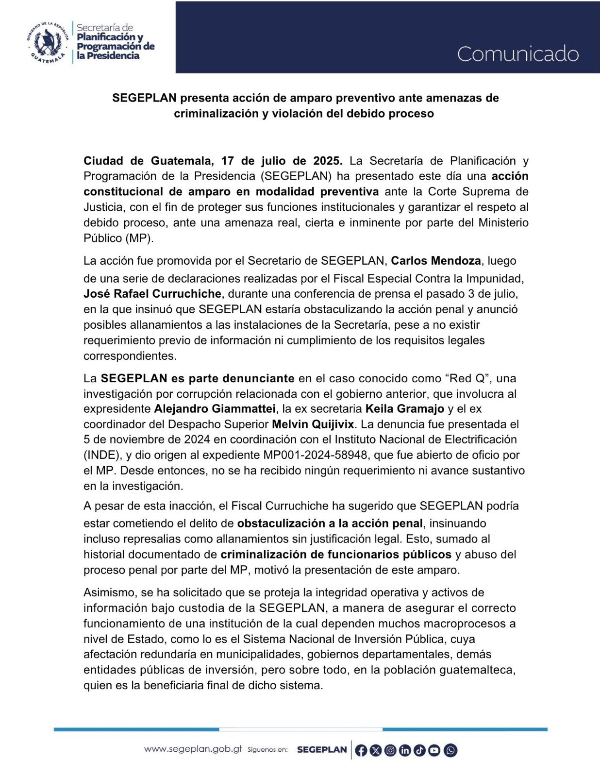 La Secretaría de Planificación y Programación de la Presidencia (Segeplan), encabezada por Carlos Mendoza, presentó un amparo preventivo ante lo que considera una amenaza inminente de acciones arbitrarias por parte del Ministerio Público (MP), en particular del fiscal Rafael Curruchiche, jefe de la Fiscalía Especial Contra la Impunidad (FECI).