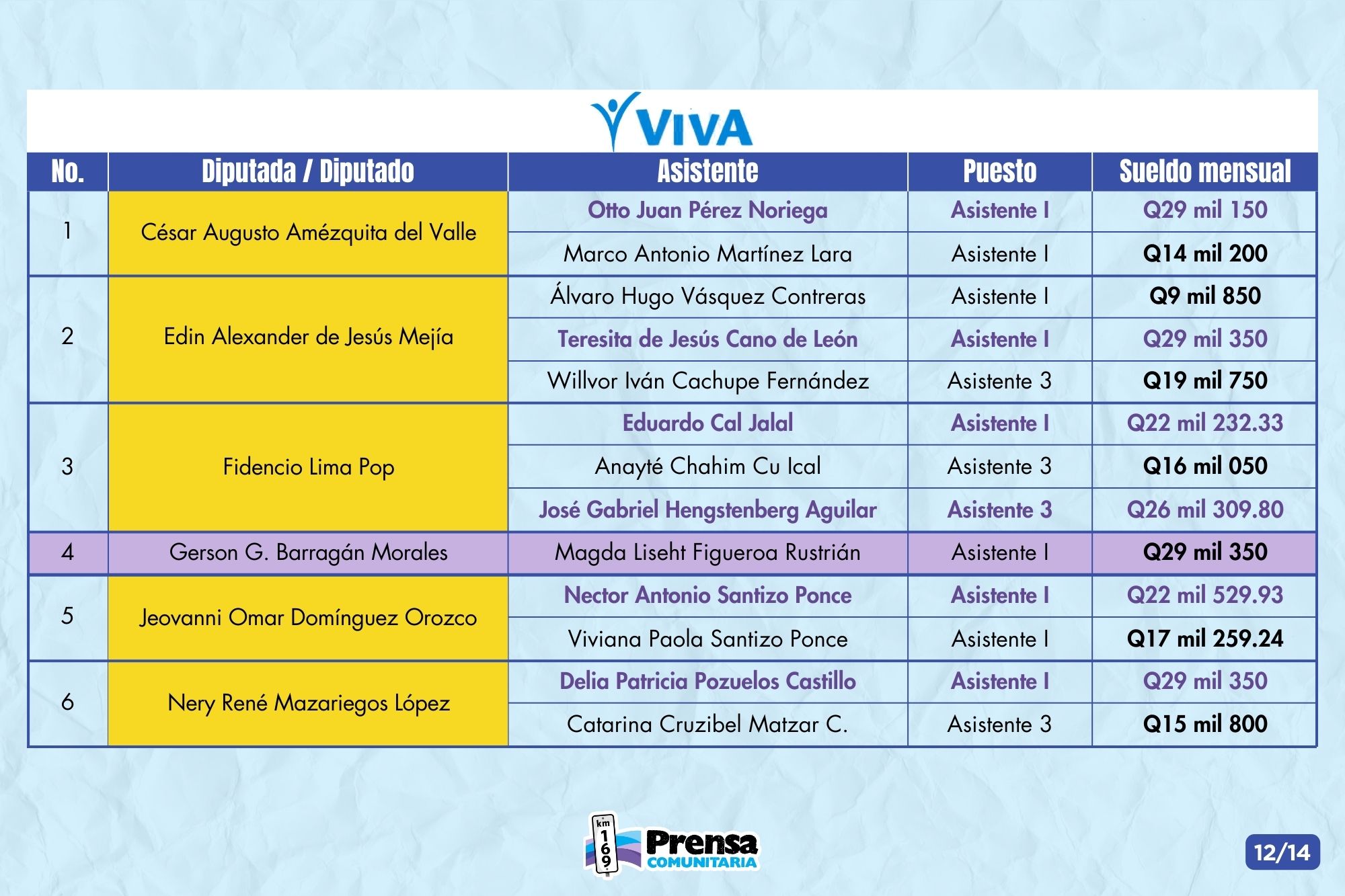 En cambio, Obbed Ediberto Castañasa Mendizábal, de VIVA, tiene cuatro asistentes I: Álvaro Mauricio Morales Monterroso, quien gana Q31 mil 499 mensuales; Axel José Ruíz Herrera, Q25 mil 150; Enma Cristina Alva Tello, Q17 mil 400 y Otto Waldemar Flores Villeda, Q20 mil 949.