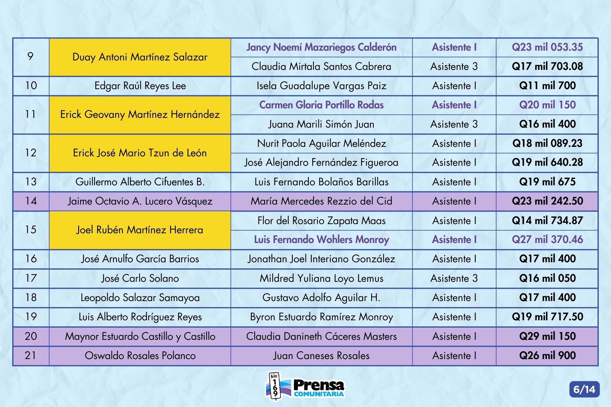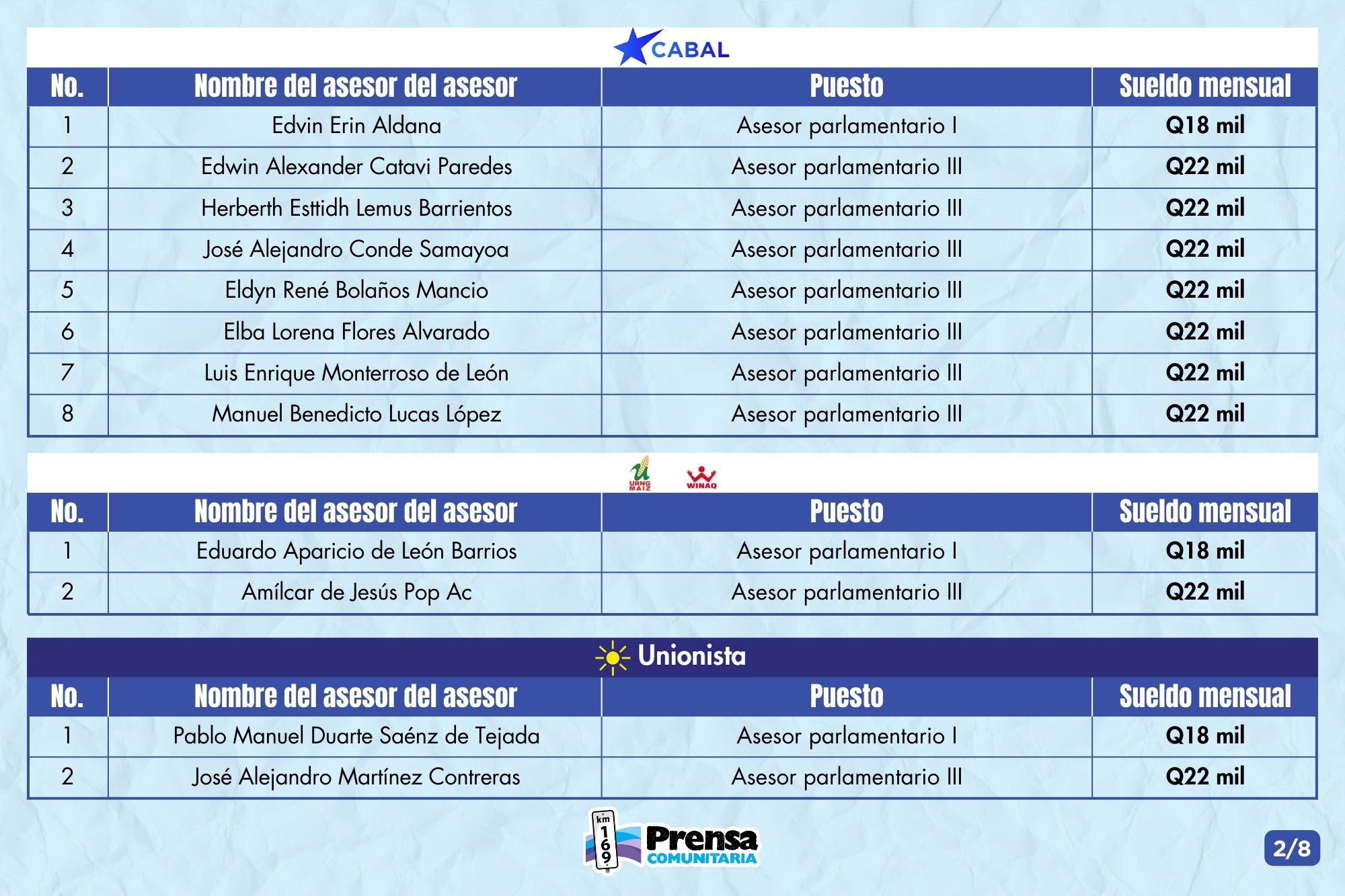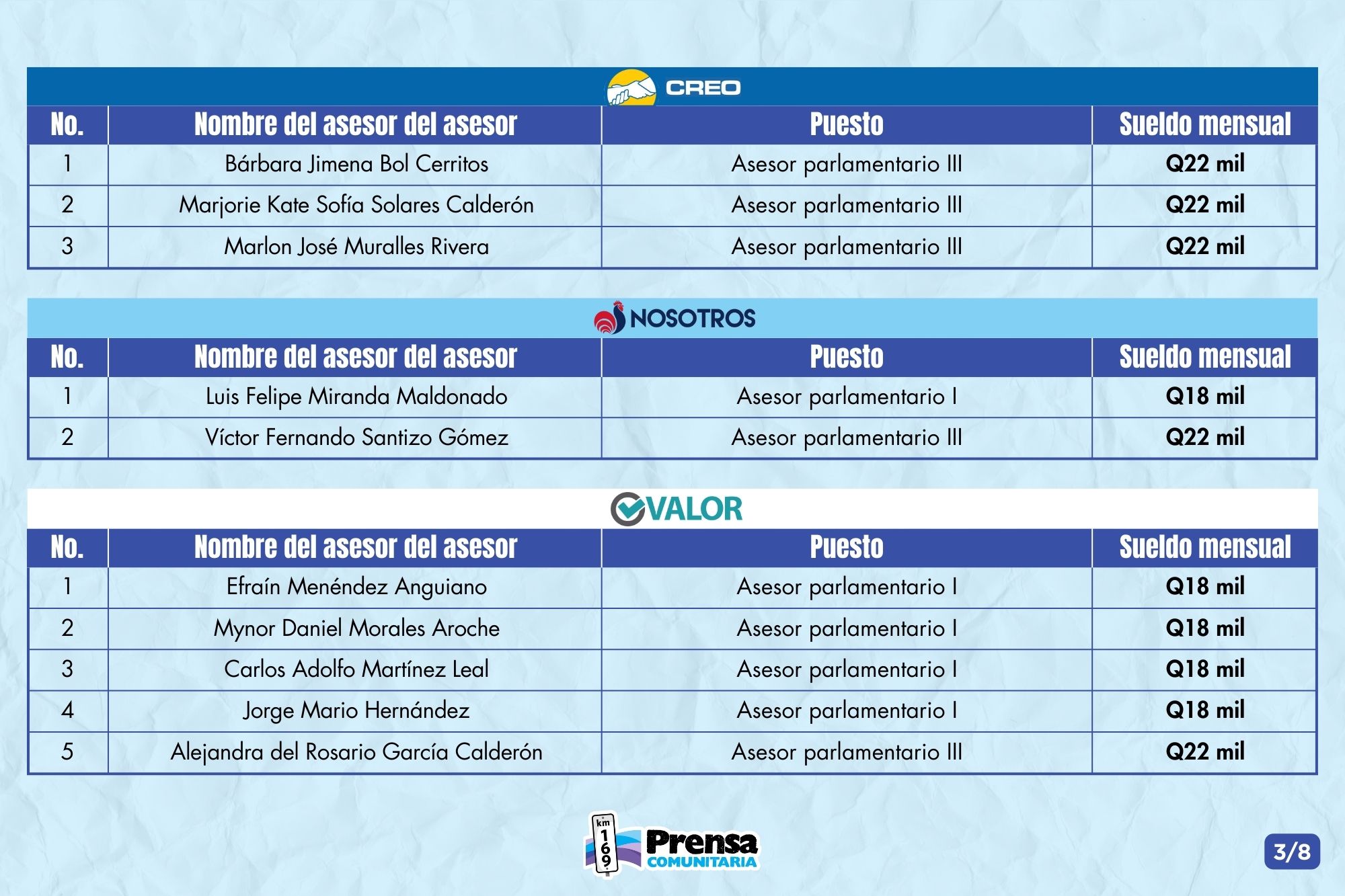 Para ejemplificar, al congresista, Carlos Enrique López Girón, de la bancada VALOR lo asiste José Nicolás Rompiche de León, con un salario mensual de Q46 mil 066 por el puesto de asistente III y Susana Ernestina Saraccini Sánchez, que gana Q16 mil 617, por asistente I.