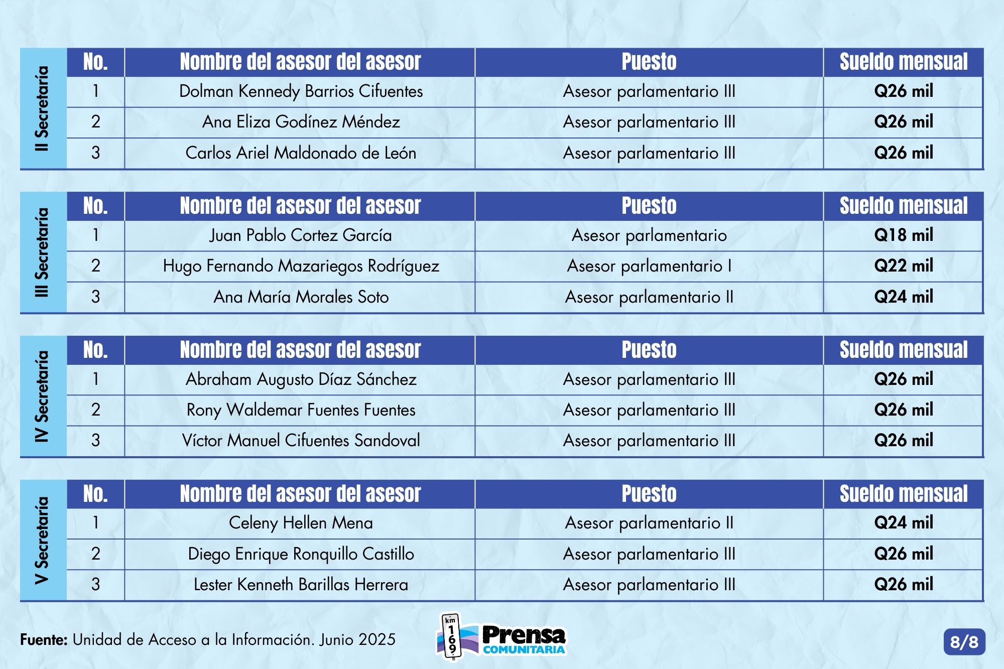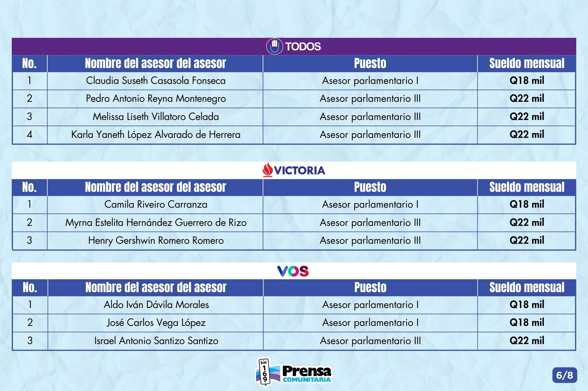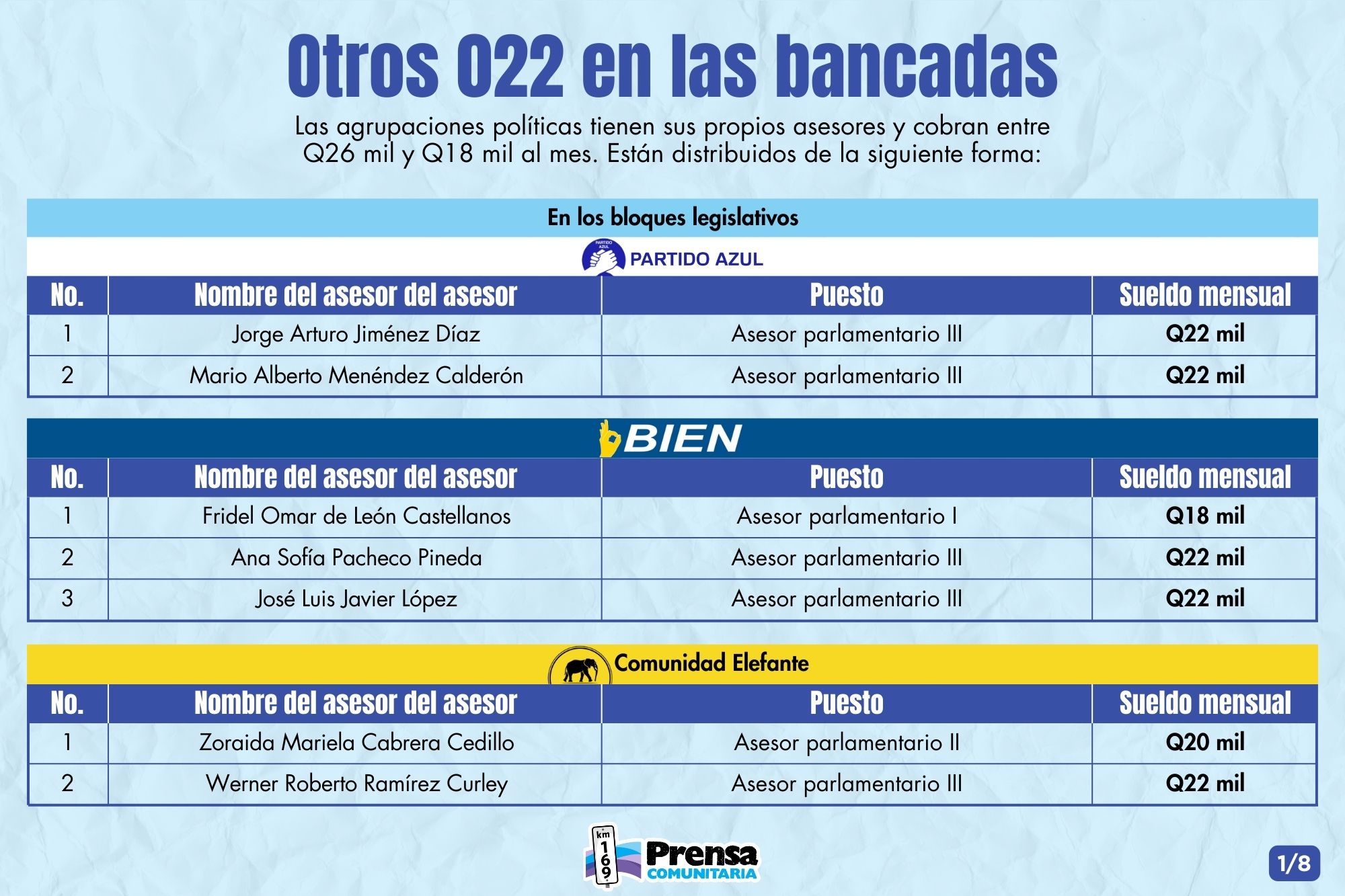 Al 30 de junio pasado, había 66 asesores del renglón 022 en las bancadas de los distintos partidos políticos, acreditados en el Congreso y otros 26 en las oficinas de la Junta Directiva. Su puesto es de asesor parlamentario I, II y III con salarios de Q18 mil y Q22 mil.