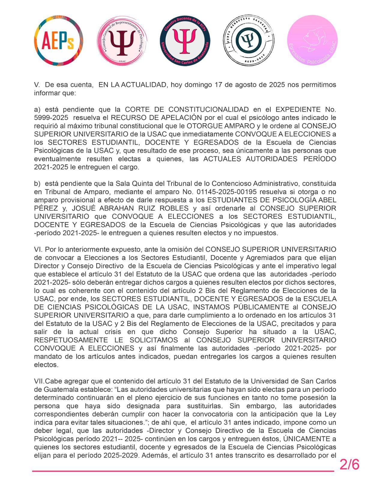 La Escuela de Ciencias Psicológicas de la USAC atraviesa una crisis legal ante la intervención realizada por el CSU a esa unidad académica. La decisión de los consejeros se concretó pese a reiteradas solicitudes realizadas por el Consejo Directivo saliente de convocar a elecciones. La intervención ha provocado la presentación de cuatro amparos en distintas instancias judiciales que buscan revertir la imposición de autoridades y restituir la autonomía universitaria.
