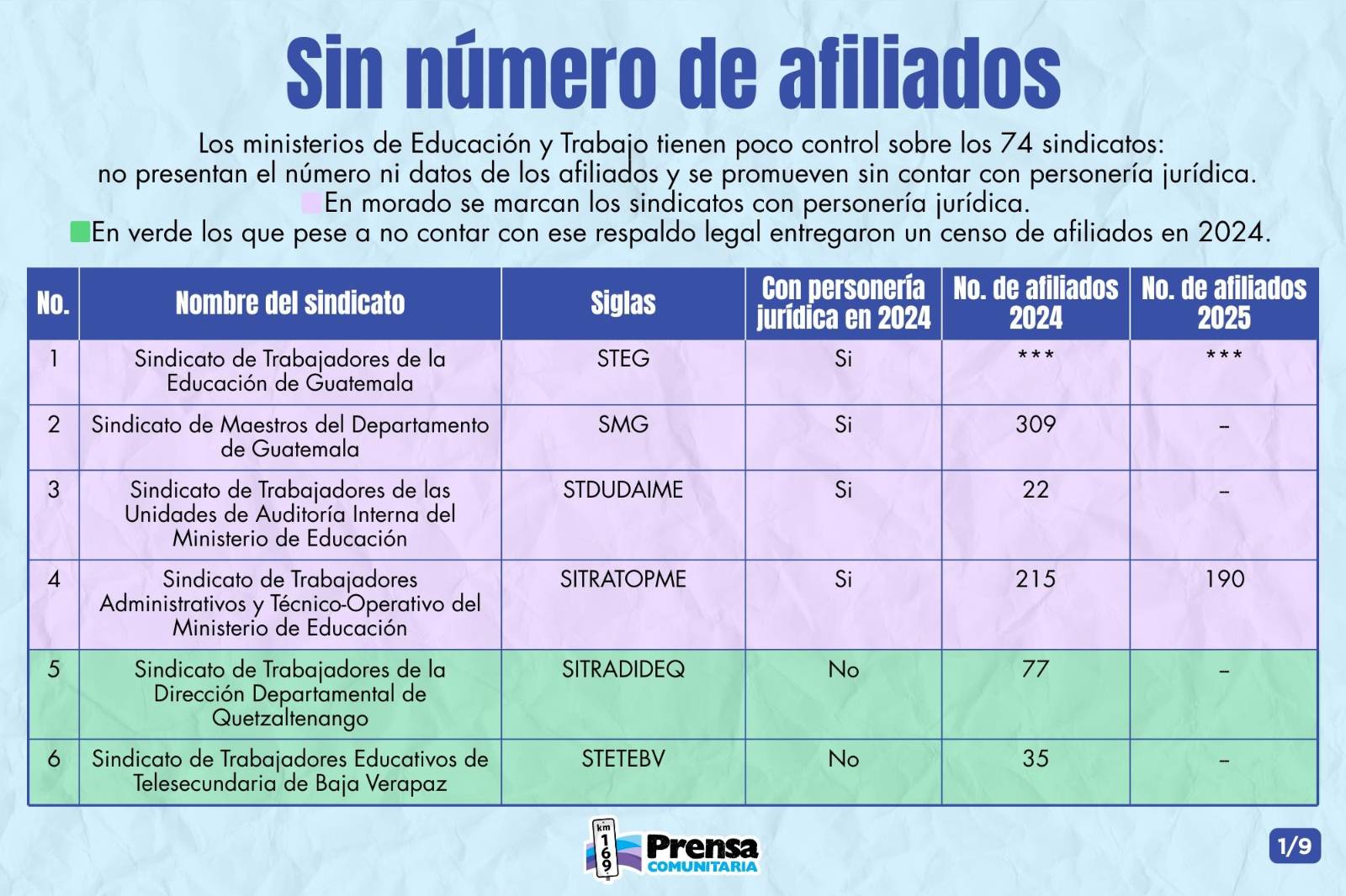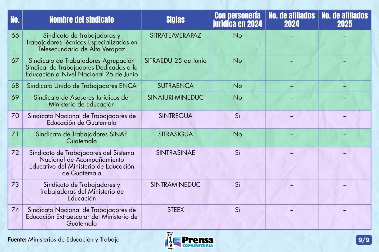 A la fecha, la cartera de Trabajo cuenta con un registro de 74 sindicatos del Ministerio de Educación, de los cuales 25 cuentan con personería jurídica, incluido el STEG. En 2024, ocho organizaciones sindicales dieron a conocer el padrón de sus afiliados.