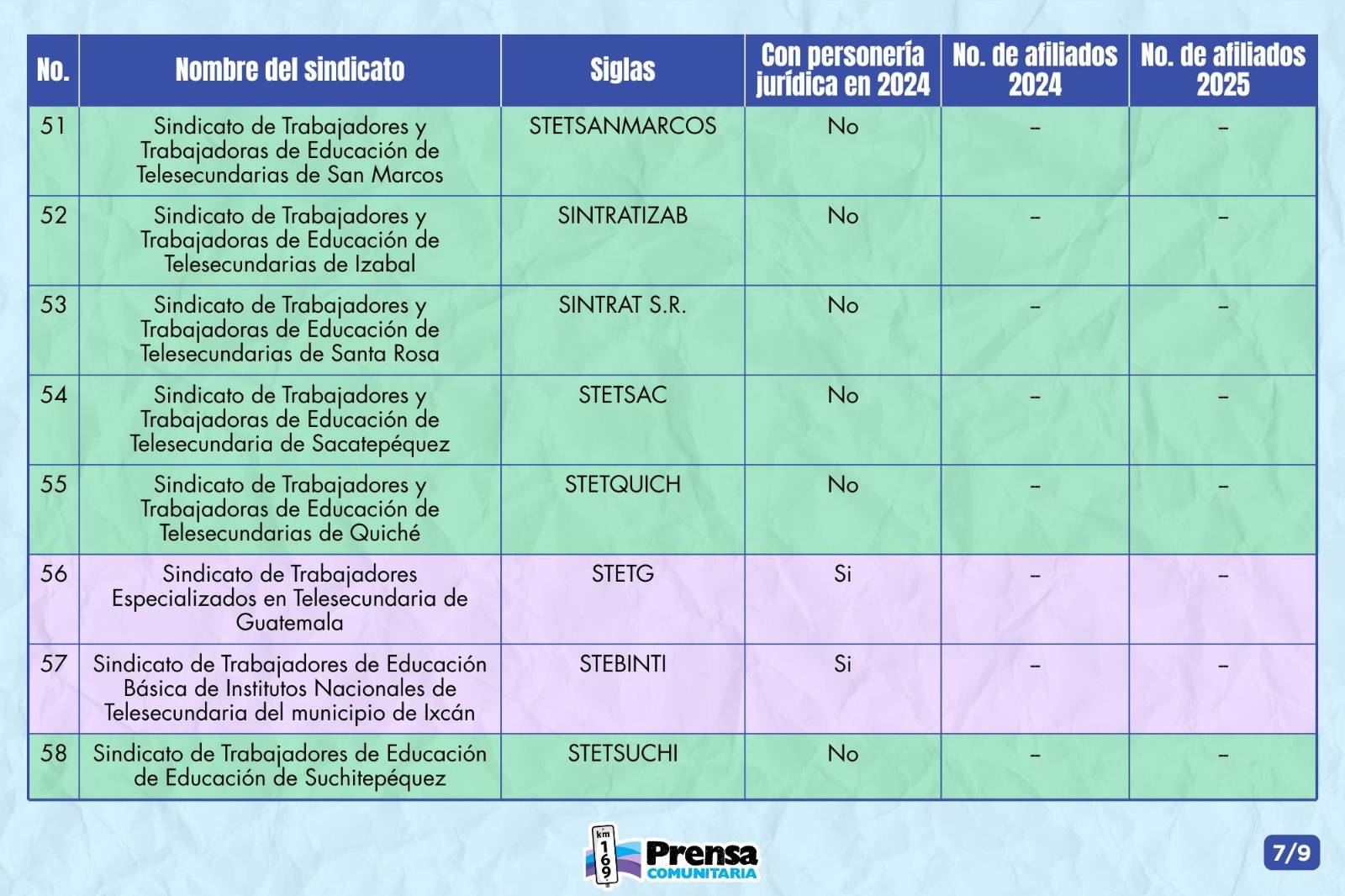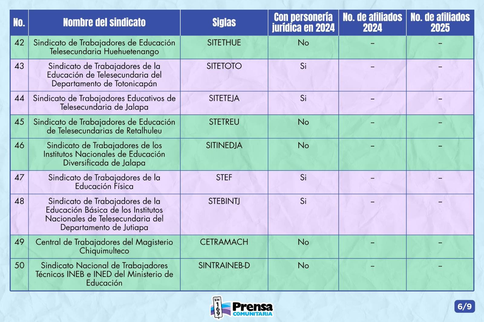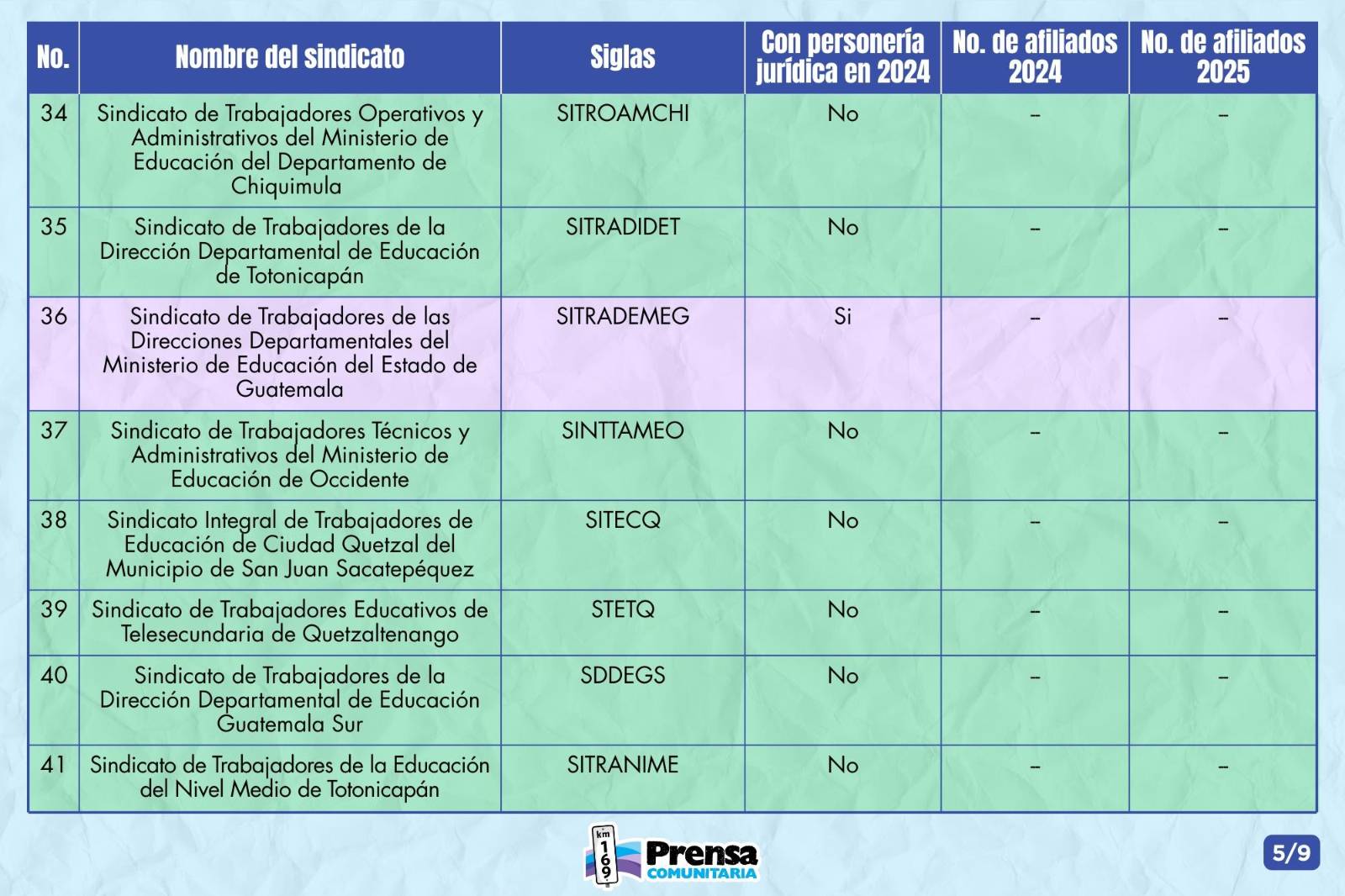 En 2022, los sindicatos adherentes fueron seis: Sindicato Unidad Magisterial para el Cambio (SUMC); Sindicato de Trabajadores de la Educación de Patzún (STEP); Sindicato de Educadores y Afines de Comalapa (SETAC); Sindicato Magisterial Poaquileño 25 de Junio (SIMAP 25 de Junio); Sindicato de Trabajadores Administrativos Técnico-Operativos del Ministerio de Educación (SITRATOPME) y Sindicato Nacional de Profesionales de la Educación de Guatemala (SINAPREGUA). La cartera de Trabajo conoce al menos el nombre de cinco de estos sindicatos, a excepción del SUMC, del que no se cuenta con registro ni en 2024 y 2025.