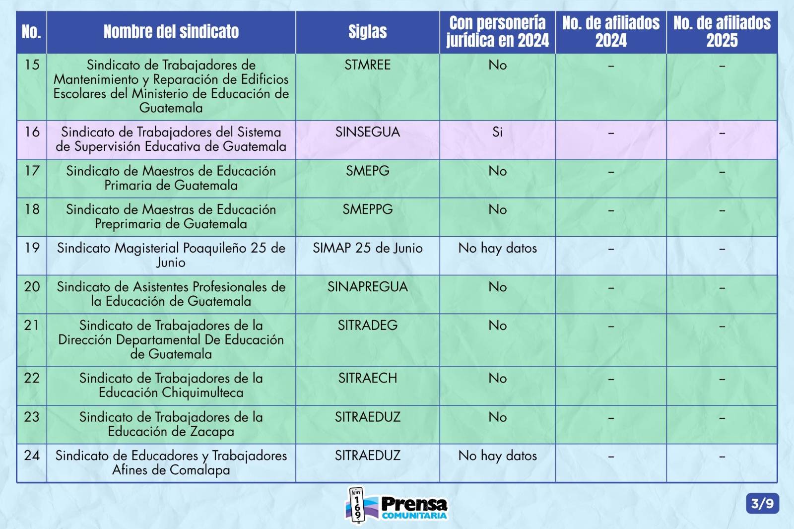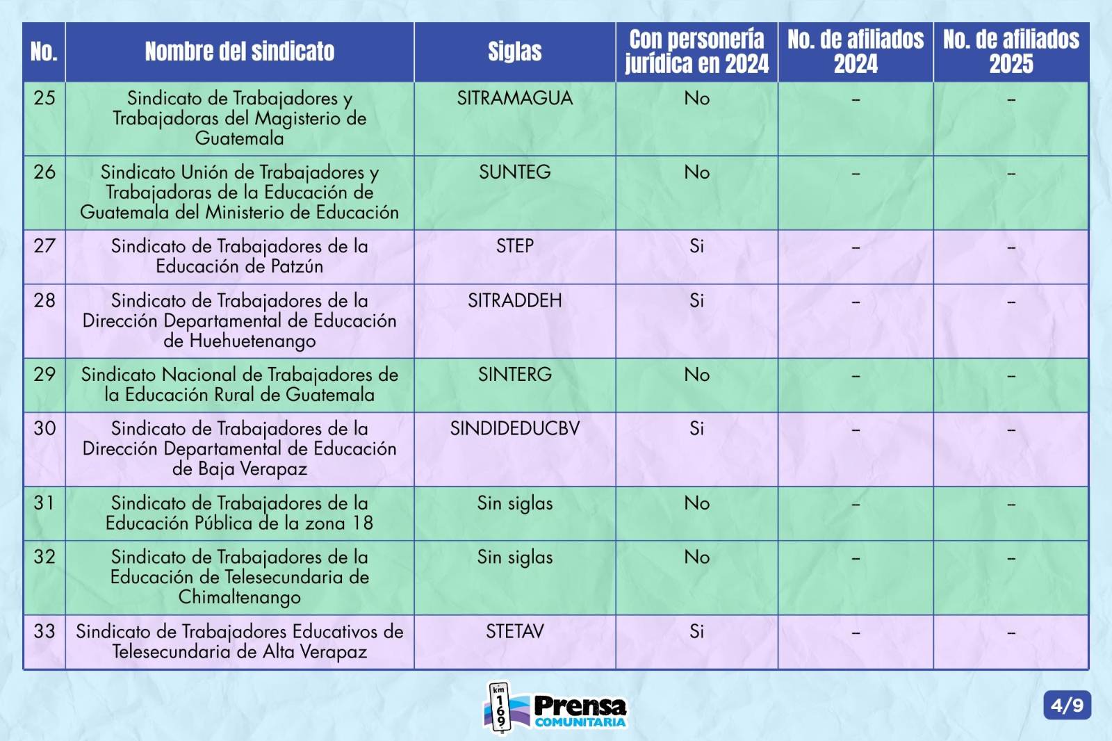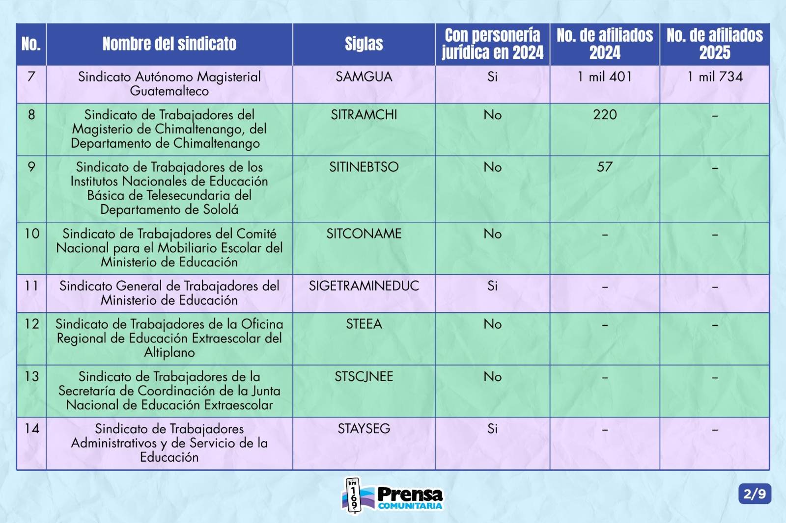 En 2022, los sindicatos adherentes fueron seis: Sindicato Unidad Magisterial para el Cambio (SUMC); Sindicato de Trabajadores de la Educación de Patzún (STEP); Sindicato de Educadores y Afines de Comalapa (SETAC); Sindicato Magisterial Poaquileño 25 de Junio (SIMAP 25 de Junio); Sindicato de Trabajadores Administrativos Técnico-Operativos del Ministerio de Educación (SITRATOPME) y Sindicato Nacional de Profesionales de la Educación de Guatemala (SINAPREGUA). La cartera de Trabajo conoce al menos el nombre de cinco de estos sindicatos, a excepción del SUMC, del que no se cuenta con registro ni en 2024 y 2025.
