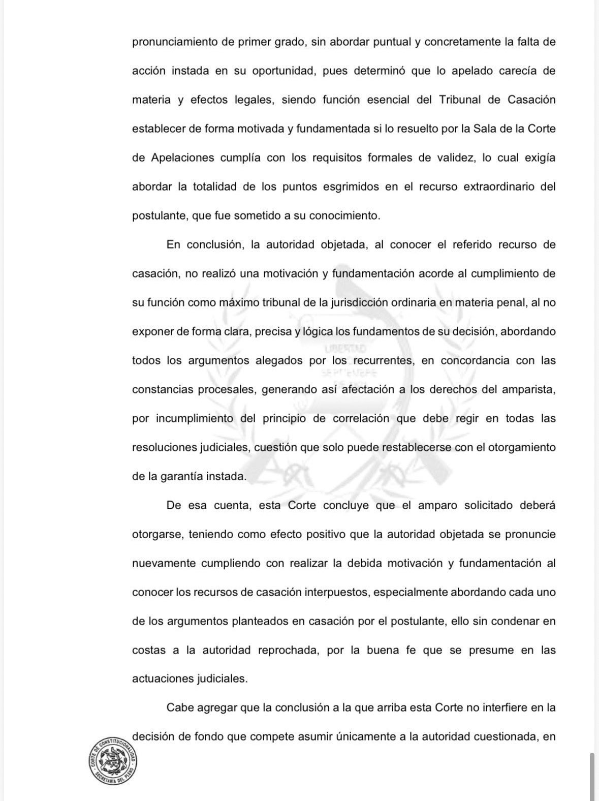 “En conclusión, la autoridad objetada al conocer el referido recurso de casación, no realizó una motivación y fundamentación acorde al cumplimiento de su función como máximo tribunal de la jurisdicción ordinaria en materia penal, al no exponer de forma clara, precisa y lógica los fundamentos de su decisión, abordando todos los argumentos alegados por los recurrentes, en concordancia con las constancias procesales”, se lee en la resolución.