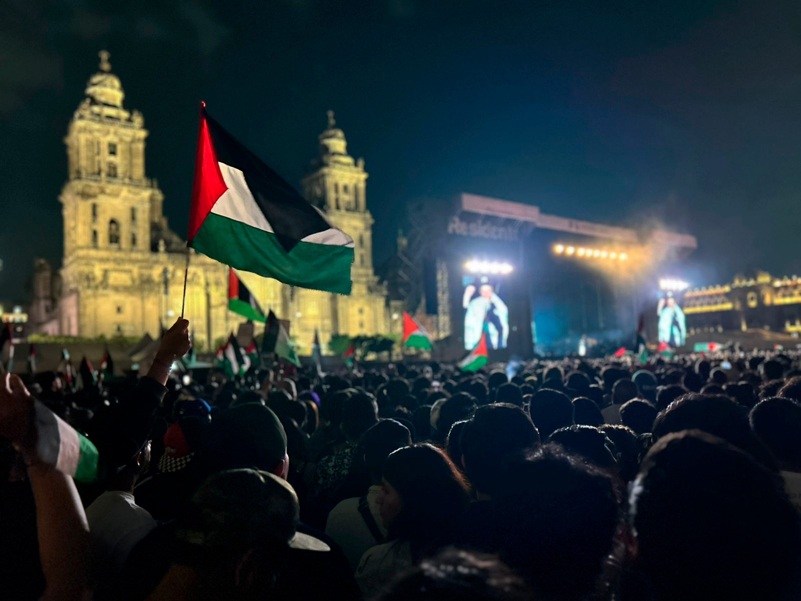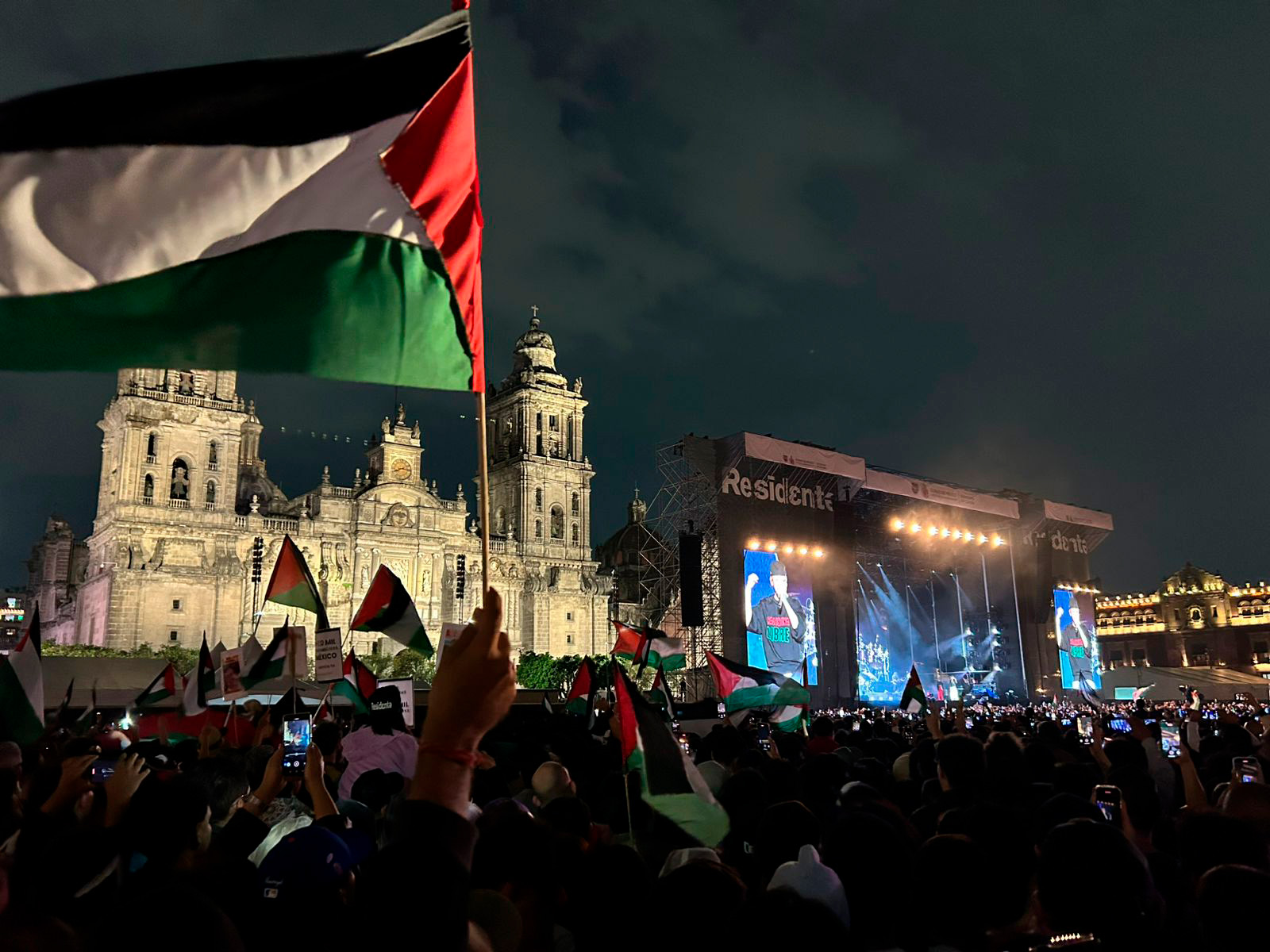 Con el Zócalo lleno, miles de voces gritaron “Palestina libre” junto a la voz de Rene Pérez Folgar, más conocido como Residente, que llamaron a detener el genocidio contra la población palestina en la Franja de Gaza.