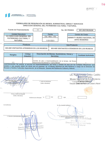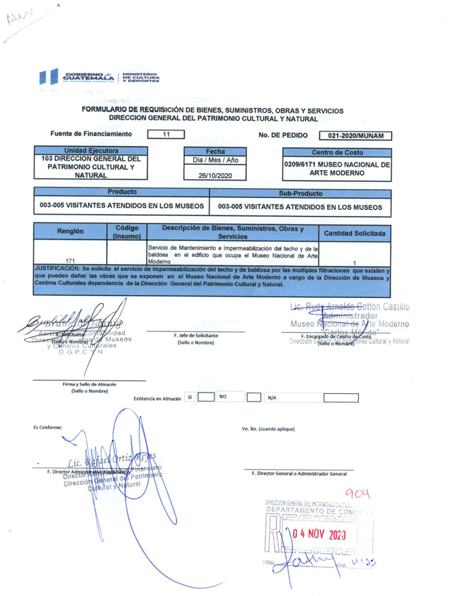 Este proceso contó también con el aval del administrador Cotton, quien el 11 de enero de 2021, firmó el formulario de “Requisición de Bienes, Suministros, Obras y Servicios, de la Dirección del Patrimonio Cultural y Natural”. Se justificó el proceso en los mismos términos del presentado un año atrás.