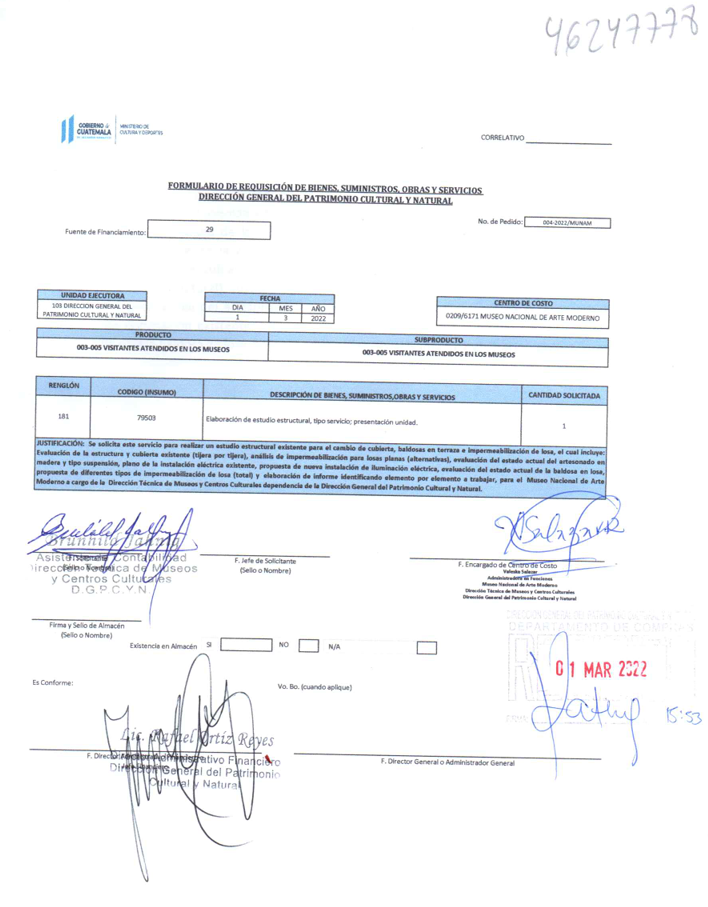 No obstante, ese día se publicó en Guatecompras un nuevo proceso con a el mismo fin: contratar un servicio “para la elaboración de un estudio estructural en el Museo Nacional de Arte Moderno”, Evento de Compra Directa 43-2022 (NOG 16734017). Se esperaban las ofertas el 17 de marzo a las 15:00 horas. El estudio incluiría lo que se había solicitado en el proceso prescindido el 15 de marzo. El pedido de la compra fue el mismo firmado por Salazar, el 1 de marzo.