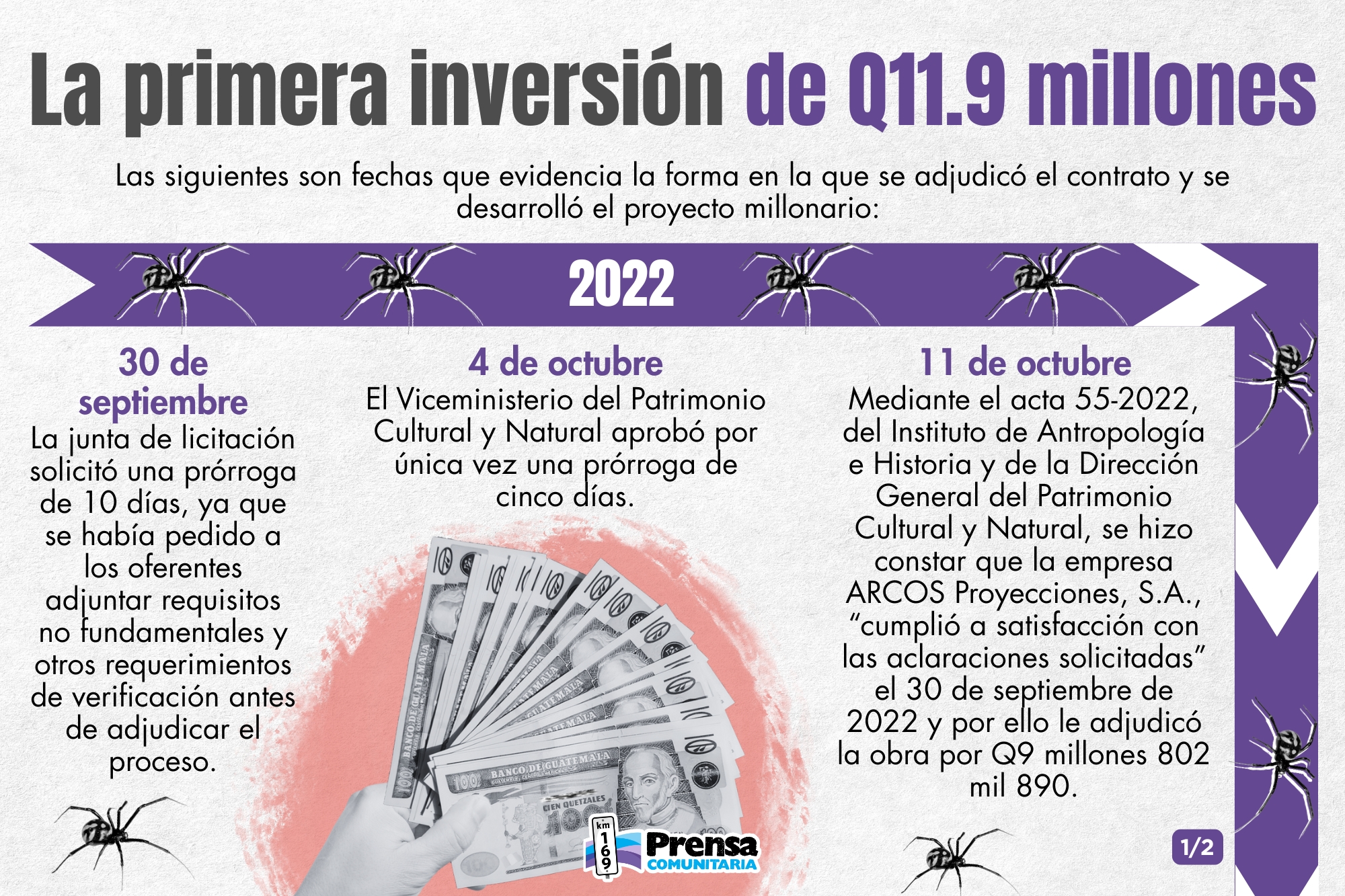El contrato se adjudicó por un monto de Q4 millones 270 mil 150, a la Constructora y Transportes J.P., S.A., el 8 de septiembre de ese año, a través del acta 54-2023 del Instituto de Antropología e Historia y de la Dirección General del Patrimonio Cultural y Natural, por “cumplir a cabalidad con todos los documentos, requisitos y especificaciones generales y técnicas requeridas”.
