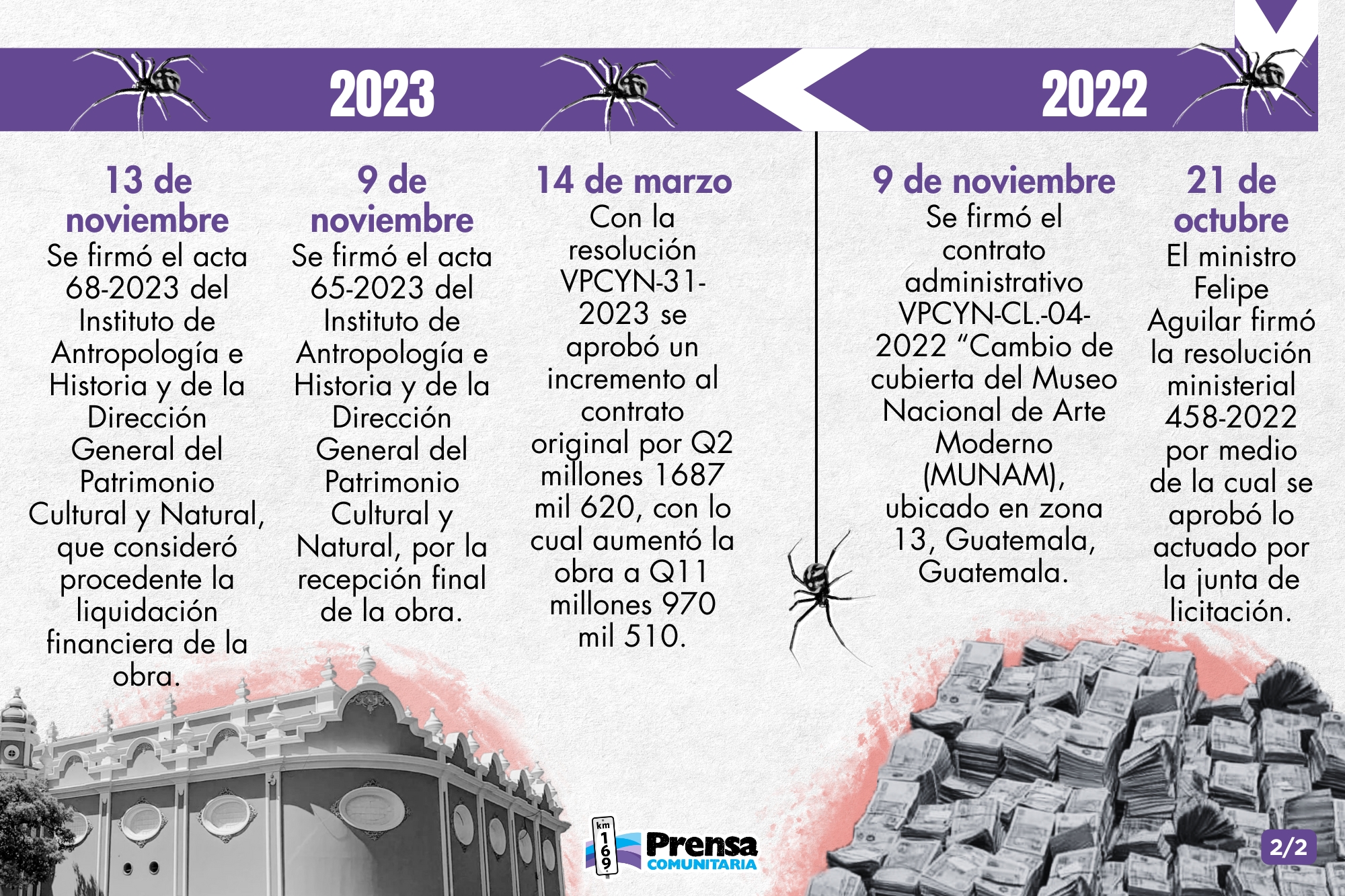 Para entonces, el Ministerio de Cultura había escalado de una compra directa en 2020, menor a Q700 mil, a una cotización y luego a una licitación millonaria con el propósito de reparar las goteras que Cotton había señalado en años anteriores.