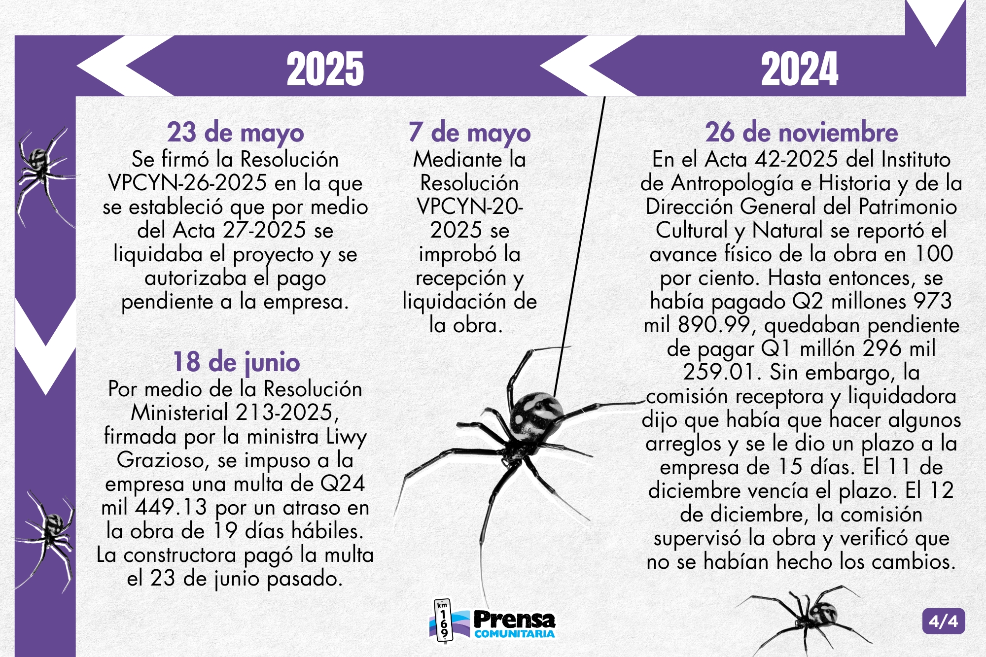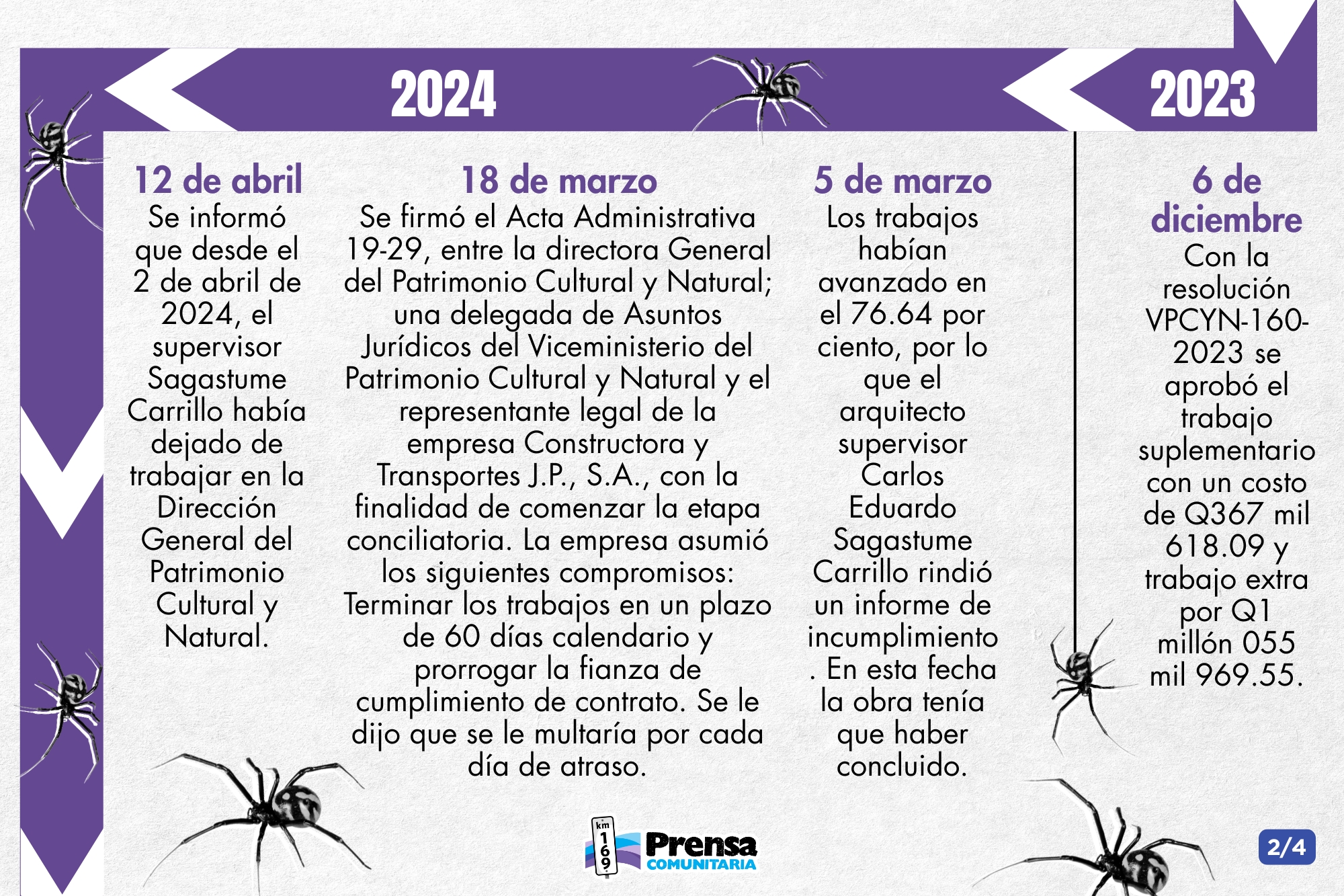 El 4 de abril de 2022, se firmó el Contrato DGCPYN-7-2022 entre Jenny Ivette Barrios Vital de Rodríguez, directora general del Patrimonio Cultural y el empresario, por un monto de Q89 mil 845 y con vigencia de 30 días calendario. Con la resolución VPCYN-20-2022, del Viceministerio del Patrimonio Cultural y Natural, del 22 de abril de 2022, se aprobaron “bajo la responsabilidad” de Barrios Vital de Rodríguez y del constructor, las 19 cláusulas del contrato DGCPYN-7- 2022.